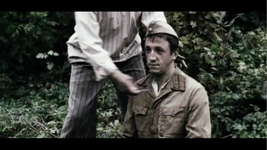 Сначала немец бреется на поезде. Ну, а после крушения поезда героиня Румянцевой бреет своего командира.