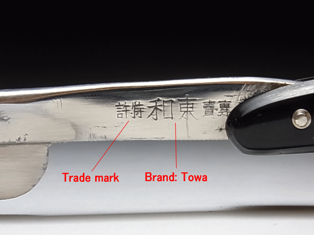 Последнее фото нашел в интернете, вроде такие же символы как и у моей. 東和 特許 (read R>L) Tōwa Tokkyo = Tōwa Patent Ссылка на источник: https://historyrazors.wordpress.com/201 ... a-towa-co/