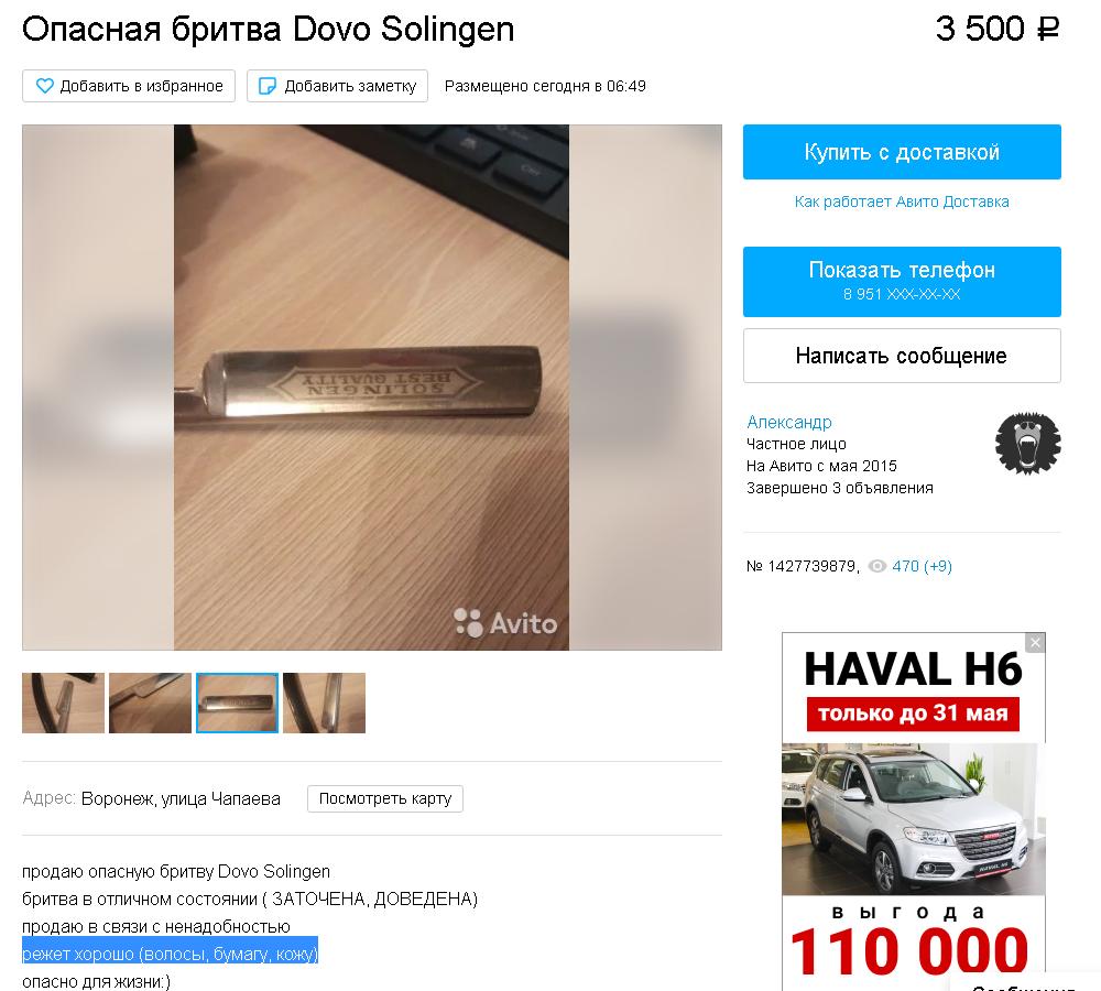 Аукционы: плагиат, развод и "великолепные" описанияИ стоило столько писать, чтобы выставить этот полутруп, еще и с обратной улыбкой. Опасные бритвы востребованы в парикмахерских, ага. Часто читаю в рекламе барбершопов, что бреем опасными бритвами, вот зачем так беззастенчиво врать