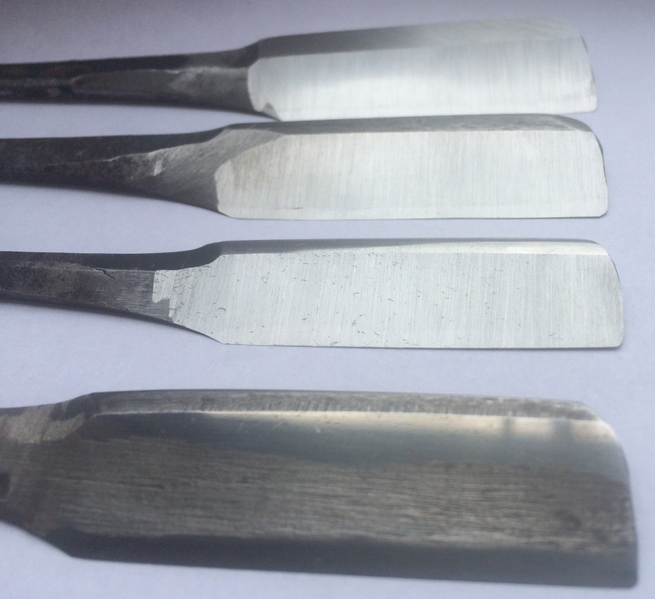 Плюс на фотках хорошо видна структура бритв. То что они составные из хагане и дзигане. На бритве до регринда так же хорошо видно что со стороны мягкой стали в оригинале дерут шабером. НО шабером твердую сталь не обработаешь так что бритвы уже шаберами не восстановить - там 55 5 каленой стали у кромки