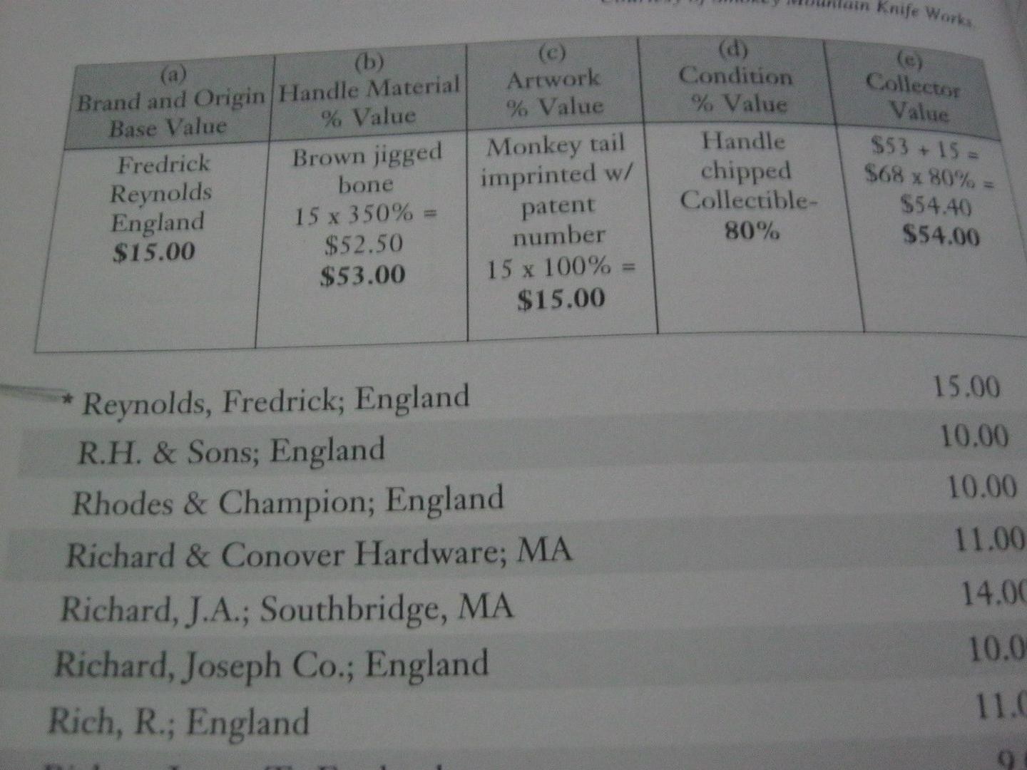 вот пример из Standard Guide to Razors (в инете полно картинок) базовая стоимость - 15$ костяная ручка - аж 350% - 53$ художественная составляющая - 100%, или 15$ итого 68$. А дальше состояние. Тут "так себе", 80% (поэтому итоговая цена 54$), бывает - идеальное 200%, в этом случае бритва бы стоила 136$. Это пример расчета, но, тут обезьяний хвост, вещь редкая, реальная цена может быть выше. За ординарную бритву, без накруток за ручку и художества, цена зависит от базовой плюс процент за состояние. Замечу, это стоимость "как есть", то есть без реставрации. Эта базовая стоимость и придумана, что бы по одинаковой методике рассчитать конечную любой бритвы. Standard Guide to Razors известен во всем мире, поэтому "там" цены крутятся вокруг этих расчетных значений. Опять же, коллекционные вещи, это аукционы и "как повезет". Vig, почём ушел тот хвост, о котором ты рассказывал? (Для примера с этим расчетом из книжки)