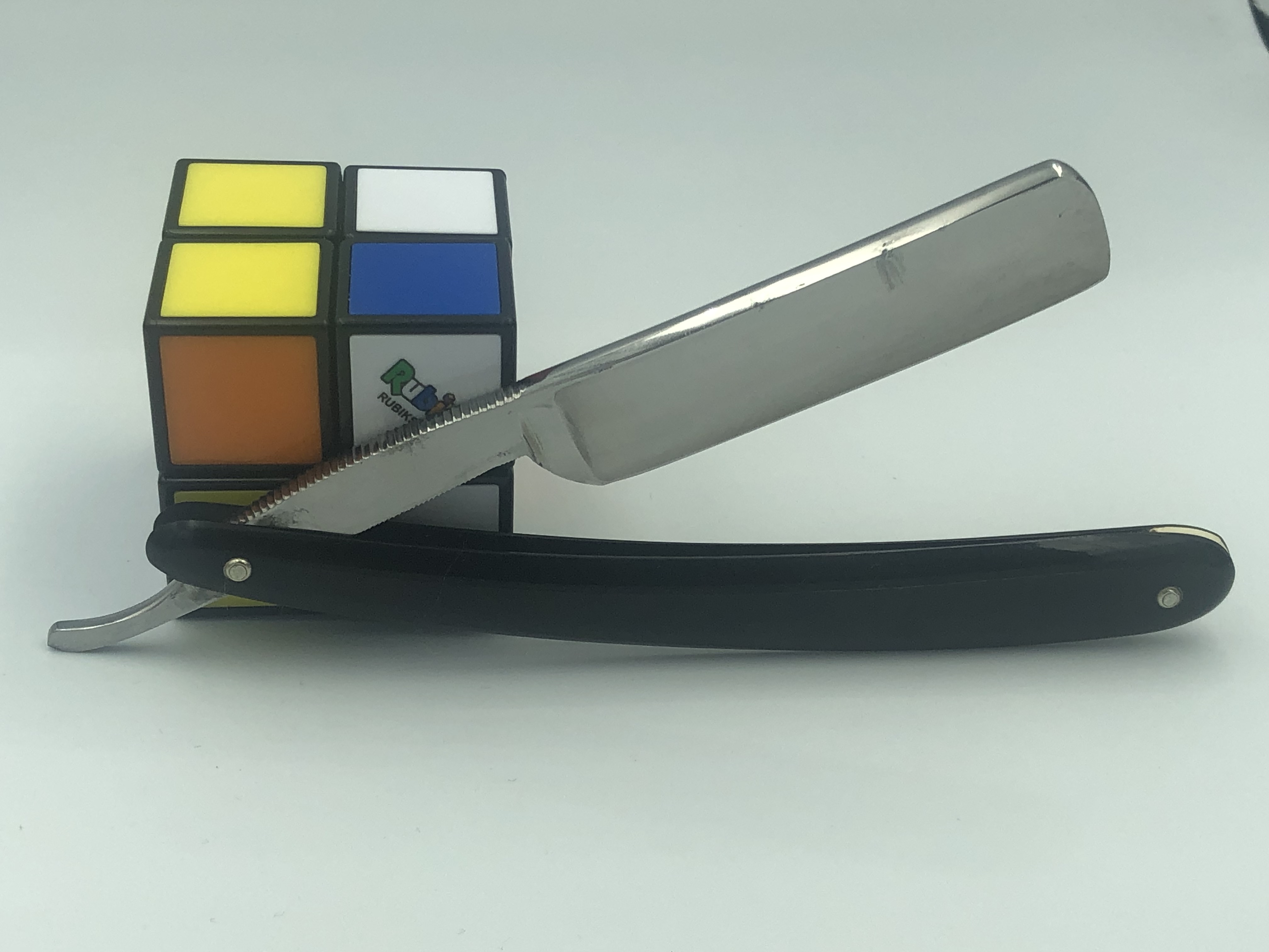 Ширина бритвы 18мм, толщина обуха 5.3мм Роговая оправа Прямая головка, клин Бритва заточена на японских натуральных камнях и готова к бритью. Родная коробочка в идеальном состоянии Цена с доставкой по миру 7500 рублей