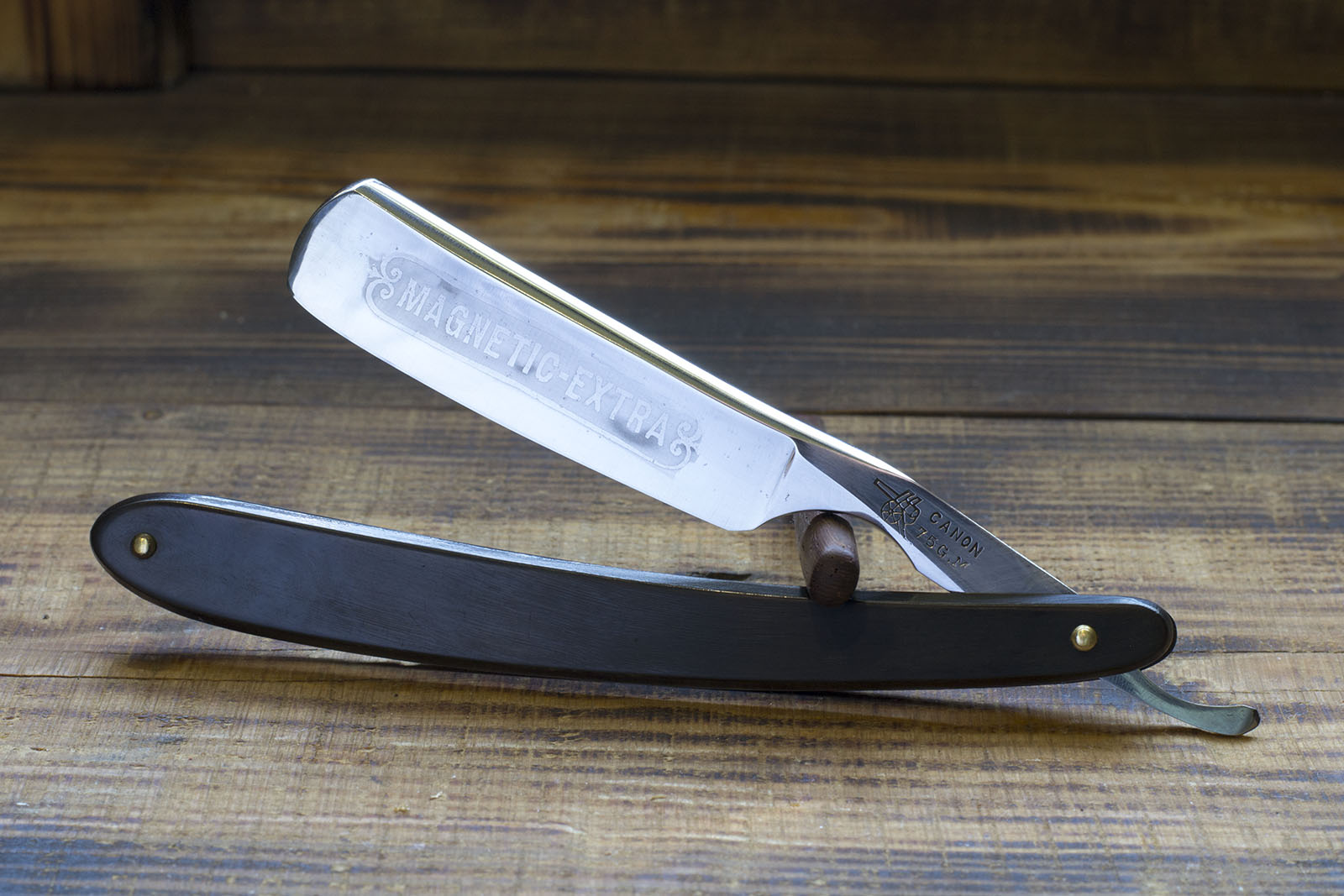 Бритва малоизвестного французского бренда, основанного в начале 20 века в городе Тьер, неким Guillemin Mallaret вероятно производство существовало и в более ранее время, просто в 1915 Малларе зарегистрировал еще несколько торговых марок, в том числе и Canon 75 G.M. Клинок сделан по классическим французским технологиям, форма так же традиционна для Тьера и Франции в целом, но эрль имеет удобную подпальцевую выемку, что является редкостью. Улыбчивая форма клинка с расширением от пяточки к носику обеспечивает очень комфортное, качественное бритье за счет имитации так называемого "косого реза". Для изготовления использована качественная литая углеродистая сталь, Magnetic Extra в данном случае является не более чем маркетинговым ходом того времени, магнитных свойст полотно не проявляет. Рукоять бритвы изготовлена из рога, вероятно буйвола, клинышек традиционно белый, но уже не из кости а какого то неизместного для меня материала. Бритва сохранилась практически в нетронутом, первозданном виде, обух не имеет следов заточки, можно предположить что бритвой не пользовались, так же на полотне есть травление - Magnetic Extra, с несколькими царапинами, но все еще читаемое. Ширина 20 мм (6/8+) Бритва заточена и готова к бритью, рекомендую новичкам, решившим освоить клин, так же интересна как экземпляр коллекции ввиду редкости. Продано Пушка Show