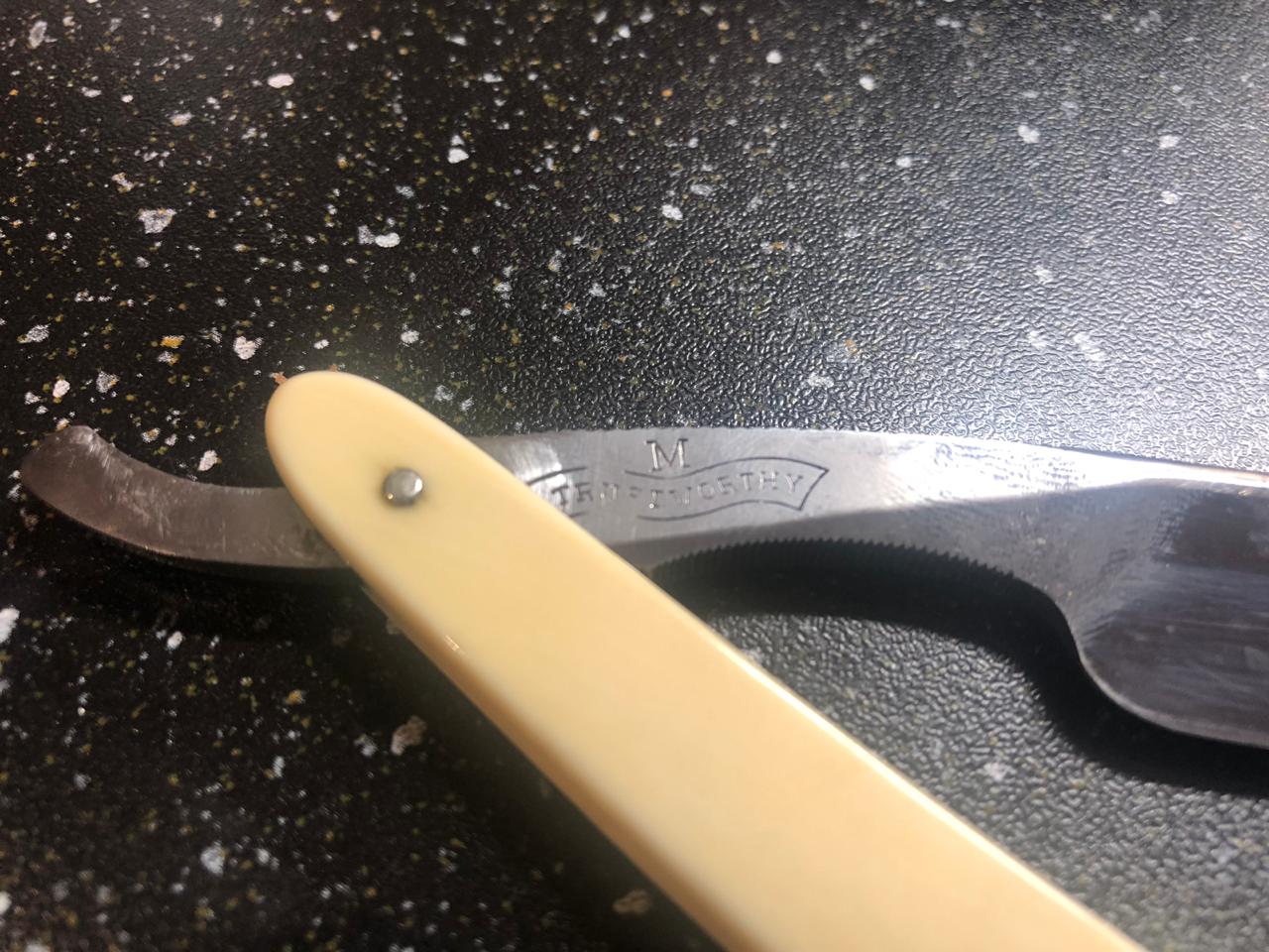 Пятна на клинке - результат воздействия горячей воды, когда подгонял пластиковую ручку к особенностям лезвия, не ровное отверстие в клинке под осевой пин. Из за этого бритва не ровно закрывалась с новой ручкой.