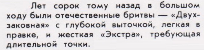 А княжеский дар им не нужен; Правдив и свободен их вещий язык И с волей небесною дружен. А. С. Пушкин. Песнь о вещем Олеге. Бритва для ООчень жесткой щетины!Нету обоснованного ответа. Для боле-менее точного ответа надо: 1. Иметь одни и теже камни на протяжении многих лет 2. Иметь одинаковую методику заточки, и эта методика должна быть измеряемой величиной. Например: на камне А - 40 кругов, потом на камне В - 60 кругов. Посмотрел в микроскоп или провел тест на волос - мало. В конце заточки все значения записать в тетрадь. 3. Переточить по одинаковой методике минимум 100 бритв каждого образца, бритв Москва 40х годов 100 штук, 50х годов 100 штук, Экстр до 55 года 100 штук, с 55 (гост) до 60 года 100 штук, Особых также, Вачу.... и т.д. 4. Сравнить записи. Вот, теперь можно делать выводы. А точить "по памяти" это не чистый эксперимент. Тут Спорт точил на фоне мягких шведок, там Экстру заточил вместе с японками, круги не считал, а в памяти остались ложные ощущения. Да, я интересовался - есть ощущения у тех, кто много точит, что Экстра потвёрже. Это подтверждают и некоторые источники, например одна известная статья из журнала Химия и Жизнь, автор Герчиков: И по теме жестких волос, из той же статьи: "Для жестких волос - мягкая бритва, для мягких волос - жесткая бритва" Кто не читал полностью эту статью, могу куда-нибудь выложить. Выводы в статье, может и спорные, но с ними (выводами) сложно спорить "по ощущениям", нужна методика и статистика. PS статья 1982 года