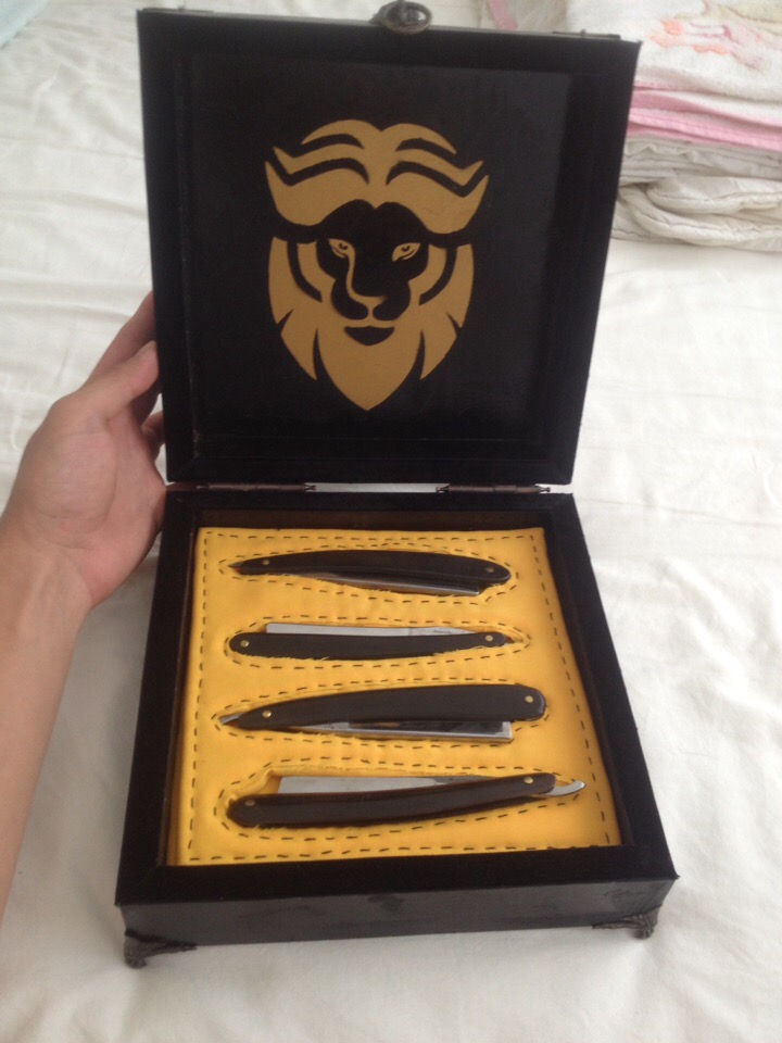 Почти год назад делал отцу ( алексей12345 ) шкатулку для бритв на День Рождения. Изделие почти первое из сделанных своими руками, так что можно сказать что я пока только учусь. Делал из остатков от советского пианино "Енисей". Что то по типу шпонированного МДФ. Но, собственно, изначально собирался в финале красить, поэтому материал особо не был важен. Макет льва (отец лев по гороскопу) для внутренней стороны напечатал на клейкой бумаге и вырезал. Внутреннюю часть крышечки покрасил золотым балончиком, наклеил шаблон льва и покрасил уже финальным черным балончиком. Для бритв сделал что то по типу подушечки с помощью ткани и изоляционной пенки для труб (часто ее до этого использовал, как мягкую прослойку для изделий). Всякую фурнитуру раздобыл путем достаточно длительного поиска на местном базаре  Ну и чисто для красоты и смягчения закрытия шкатулки кайму каждой из половинок проклеил тоненькой полоской бархатной ткани