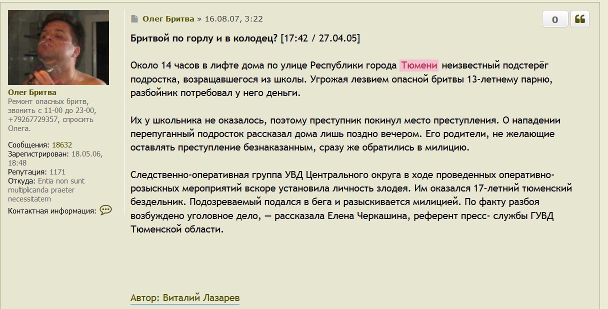 Кто из какого города или ищем земляков-единомышленников.В августе 2007-го... Не знаю кто из какого города, я из страны Москва. Ремонт опасных бритв, звонить с 11-00 до 23-00, +79267729357, (viber, whats app, telegram, VK), спросить Олега.