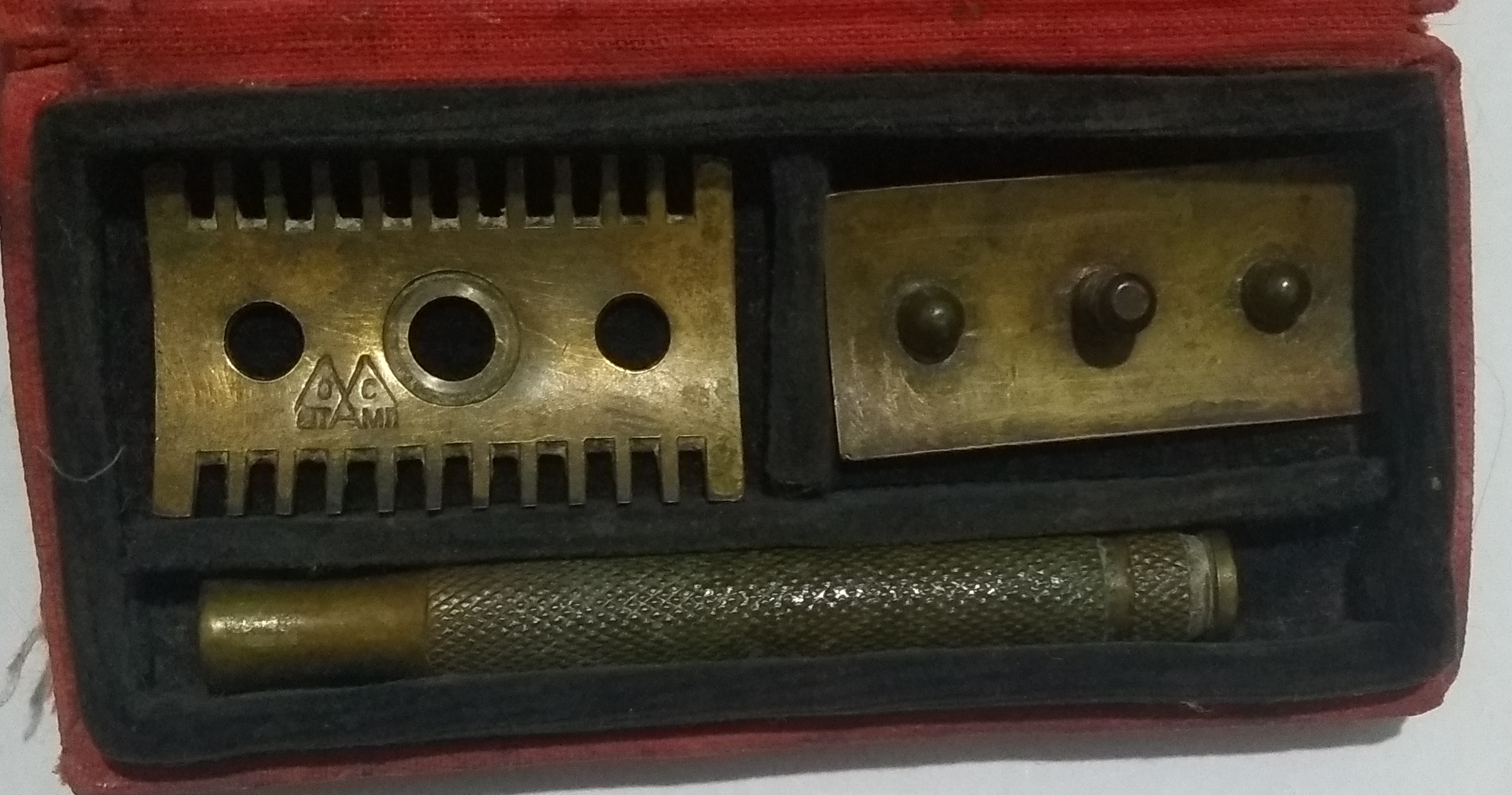 Коробочка от Красной Звезды, а сама бритва = Мосштамп. Формально это один и тот же завод, но бритва выпущена до лета 38 года, а коробочка после. Что уменьшает ценность комплекта.