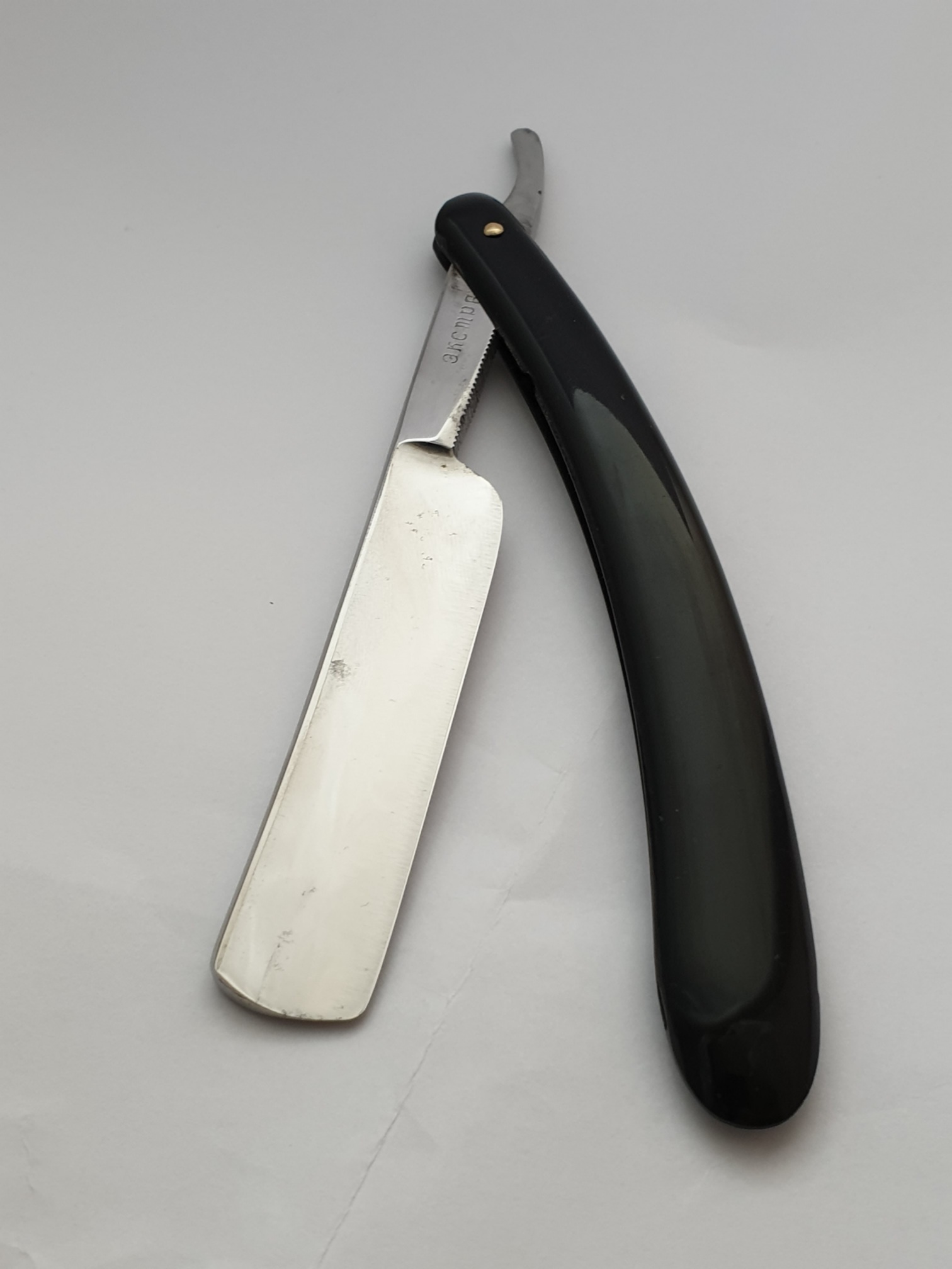 Продаётся от S&T56. Бритва под восстановление, продается как есть. Bengall cast steel, ширина клинка 17мм, обух 4мм, длина рабочей кромки 70мм. Ручка вероятно не родная, целлулоид, ровная, без дефектов.