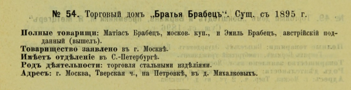 стальных изделий братья Брабец В дер. Поповке Владимирской губ. Муромского уезда. _________________________________________________ Главные заслуги процветания фабрики принадлежат основателю фабрики Матвею Оисповичу Брабецу и управ. фабр. Муромскому *******ну Е.Е. П*********. Производство: ножи, вилки, щипцы, кухонные приборы и проч. Годовой оборот до 40.000 руб. На выставках фирма получила много почётных наград. На Всероссийской Выставке в Нижнем-Новгороде 1896 года фирма награждена бронзовой медалью. Все говорят, что мы в месте…