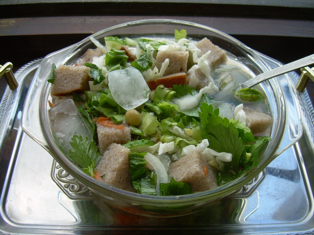 Вспомнил о древнерусской кухне. На Руси был целый ряд холодных первых блюд: холодники, свекольники, окрошка, тюря, ботвинья. Вот и решил приготовить тюрю (она же мурцовка) - далекий предок современной окрошки, холодный хлебный постный суп. Наши предки её готовили на специальном светлом кислом квасе, но у меня на магазинных блюдо не пошло. Кипячу воду на ночь, с утра остывшую ставлю в холодильник. В миску крошится или нарезается хлеб (желательно черствый), а дальше принцип как в салате - вся зелень, которую Бог послал. В моем холодильнике нашлись: капуста, листья салата (латук), лук, морковь (из морозилки), листья мяты, зеленый горошек, свежий огурец, чеснок, петрушка. Солим по вкусу, добавляем пол-ложки подсолнечного масла (предпочитаю нерафинированное), слегка подкислил свежевыжатым соком из лимонной дольки. Залить водой, размешать и кушать. Впрок не заготовляется. Добавляю в миску и кубики льда (также из проваренной воды, разумеется). Блюдо очень простое и быстрое в приготовлении (минут пять - холостяки оценят), довольно сытное (видимо, за счет хлеба), мультивитаминное (присутствует вся сезонная зелень), легкое (потому как постное), тонизирующее и освежающее