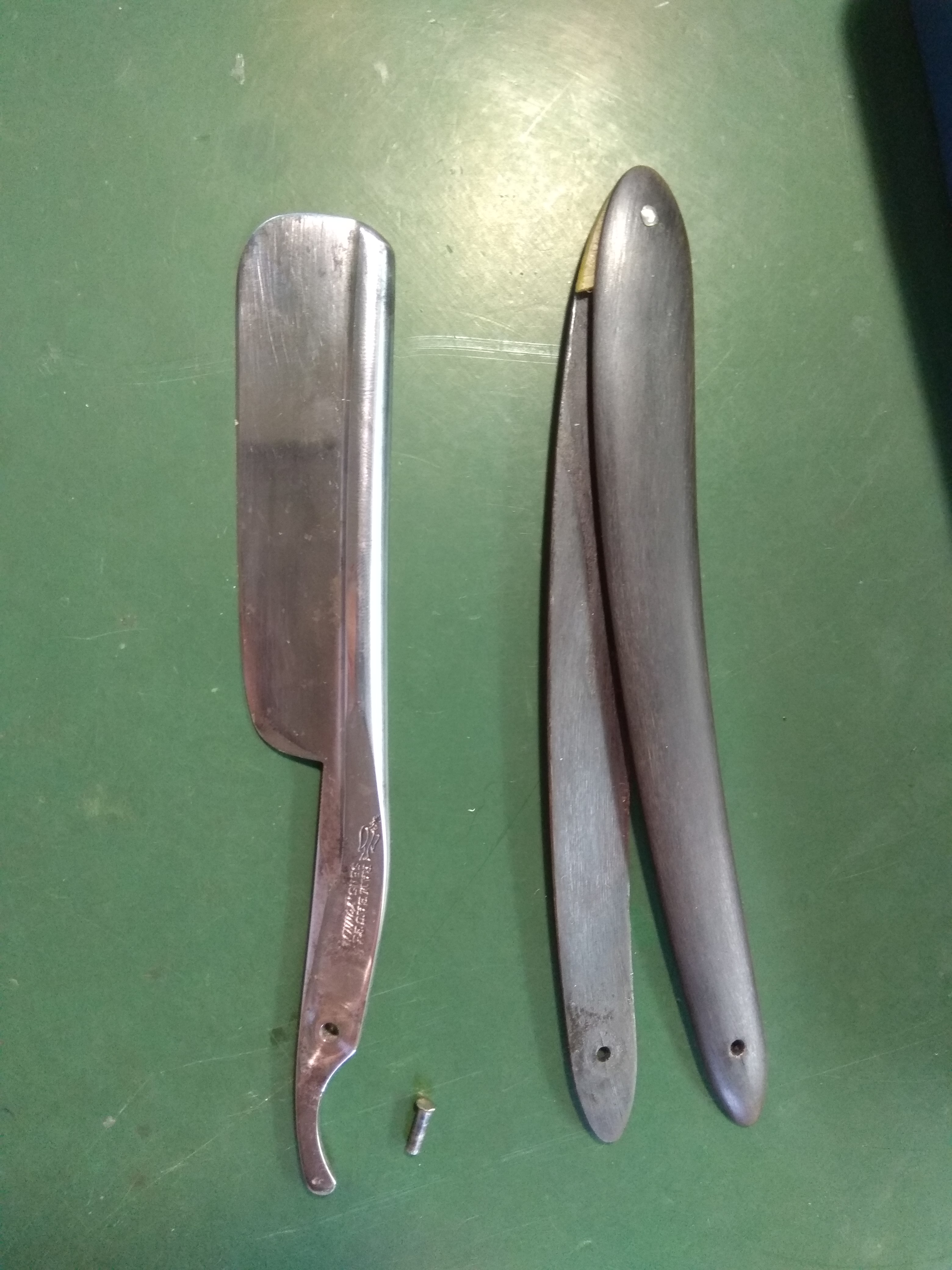 Начинающие реставраторы...оставлю тут тоже эту бритву. поначалу думал, что желтенькая ржавчина слетит на раз, а не тут то было...драил ее вручную, от этого это все затянулось на 5 часов, даже к надфелю пришлось прибегать, потому что насечки по обуху уходят аккурат над осевым пином, хорошо, что когда-то прикупил маленького размера надфилек производства советов. рытвинки остались, но, считаю, что в рамках приличного. плюс клеймо нужно было максимально уберечь.