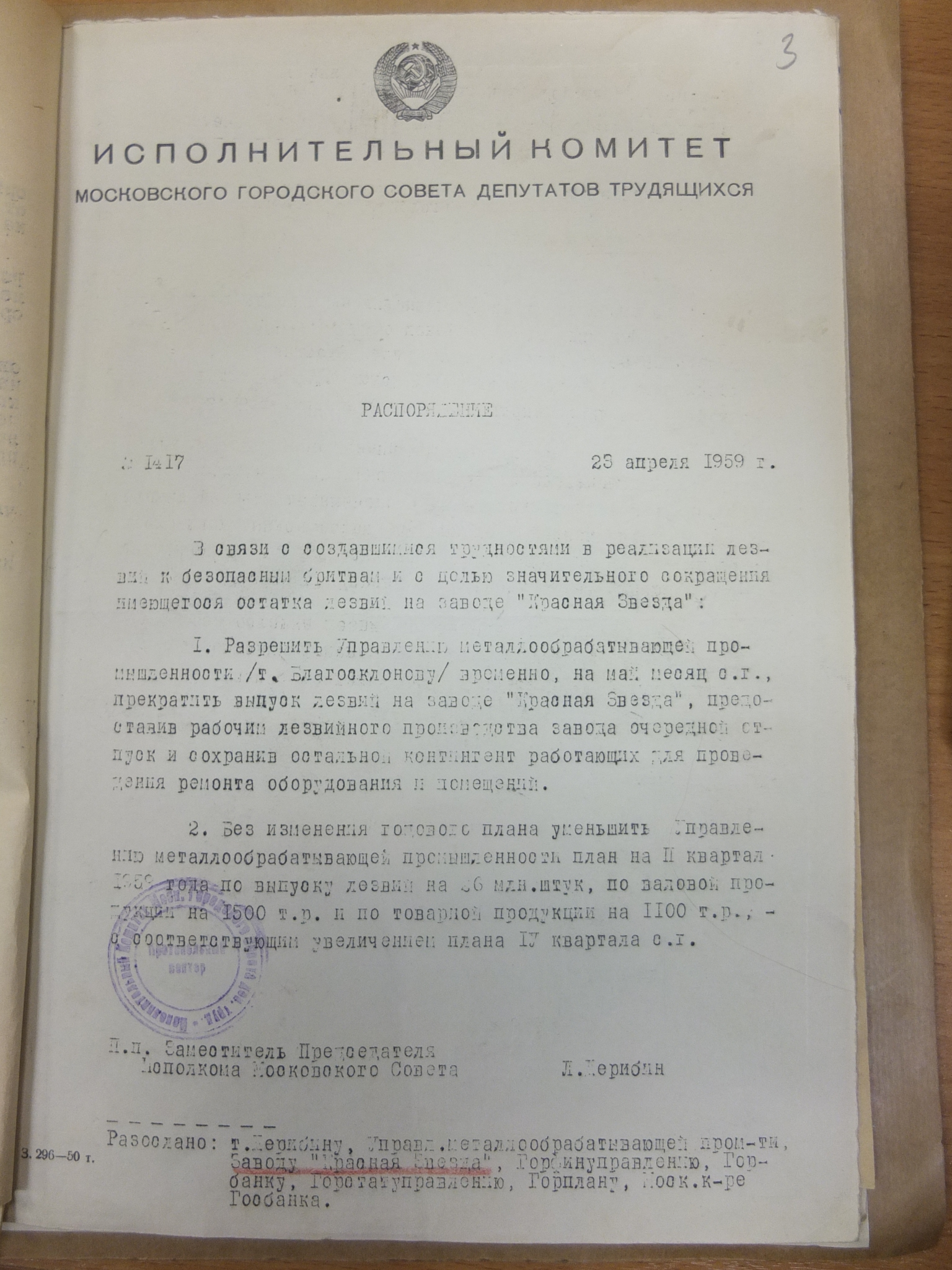 Жаль, что по СТИЗу в городских архивах документов почти нет, но я внимательно изучил документы по заводу Красная Звезда (безопасные бритвы и лезвия). Они со СТИЗом входили в один трест 1. В конце года составлялся годовой отчет установленного образца с указанием остатков на счетах, в касса и на складах. Если остаток товара на складе был выше некого значения это требовало дополнительного объяснения. Заготовить "впрок" нельзя было даже теоретически. В добавок был план даже на "сверхплановую продукцию", т.е. нельзя было изготовить миллион штук сверх плана. А можно было оговоренные 3-5%, в исключительных случаях завод просил увеличить лимит на перевыполнение плана. Поэтому в 1971 году "использовать заготовки пятилетней давности" было нельзя, по причине их отсутствия. 2. По поводу плановости: План на следующий год формировался исходя из заявок всевозможных Торгов (ударение на первый слог: Мосторг и прочие тОрги). У магазинов плана по продажам не было (как сейчас) а были лимиты на количество продукции на складе. Например в любой момент времени на складе магазина должно быть бритв - 100шт, сковородок 50шт, авторучек 300шт и т.д. Товаровед контролировал остатки и, при их уменьшении, делал заявки на пополнение запасов вверх по складской цепочке. На каждом складе свои лимиты и свои заявки дальше. В конце цепочки торговое управление делало заявку на завод. И все это проходило через статбюро и госплан. Из за этого данная система была очень медлительной и неповоротливой. 3. Затоваривание: После составления плана на следующий год ( в конце предыдущего) завод начинал выпуск продукции. Теоретически Торги должны приезжать и забирать продукцию для пополнения своих складов. НО! Люди, вдруг переставали покупать, в нашем случае, бритвы. Магазины не запрашивают склады и, дальше по цепочке, Торги не едут на завод забирать продукцию. На заводе происходит затоваривание!! Это ЧП отраслевого масштаба! Вот пример документов при затоваривании лезвиями на Красной Звезде: Исполком Мосгорсовета решает что делать, в данном случае приказывает остановить производство, рабочих отправить в очередной отпуск, кого нельзя - заняться ремонтом помещений. В конце документа участвующие организации в переписке и решении проблемы: