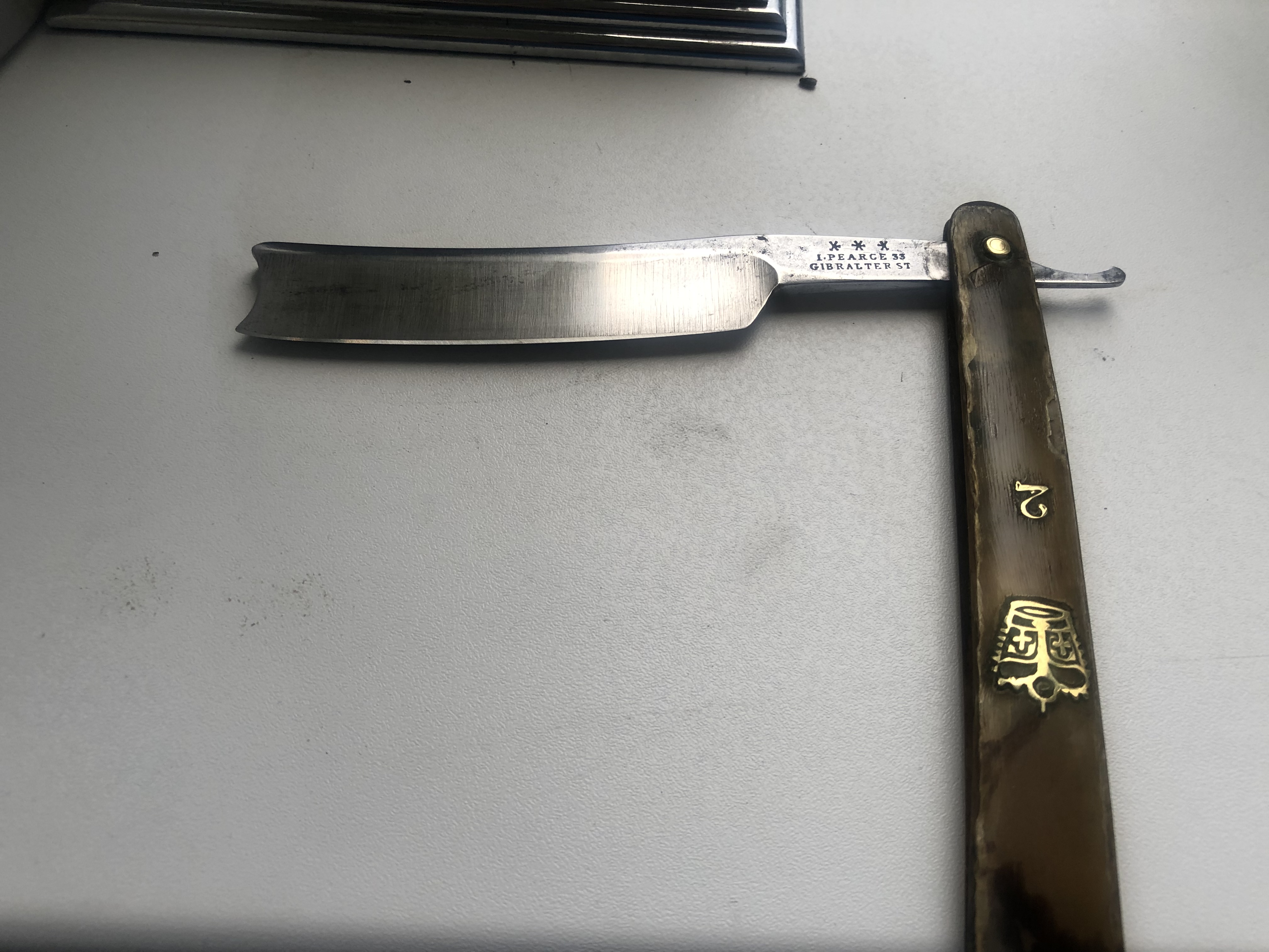 http://collections.museums-sheffield.or ... 7adab03cf5 Эта фирма берет свое начало в 1820-х годах, когда Джон Пирс торговал как производитель бритв на Гибралтарской улице в Шеффилде. В переписи 1851 года Пирс был зарегистрирован как работодатель девяти человек на Angel Street. Фирма Джона Пирса переехала и находилась на "15 Angel Street", в центре города, с 1836 по 1839 и "38 Angel Street" между 1840 и 1852. В ранние годы специализировались на ложках. После его смерти, его зять Henry Hobson продолжал торговать, используя имя Пирса. Торговое название и марка, буквы «JP», продолжали использовать и в 20-м веке. По поводу I-J английский народ пишет, что так принято было тогда. И по поводу названия улицы, в журналах того времени то Gibralter, то Gabraltar Древняя бритва, 1820-1835 годы
