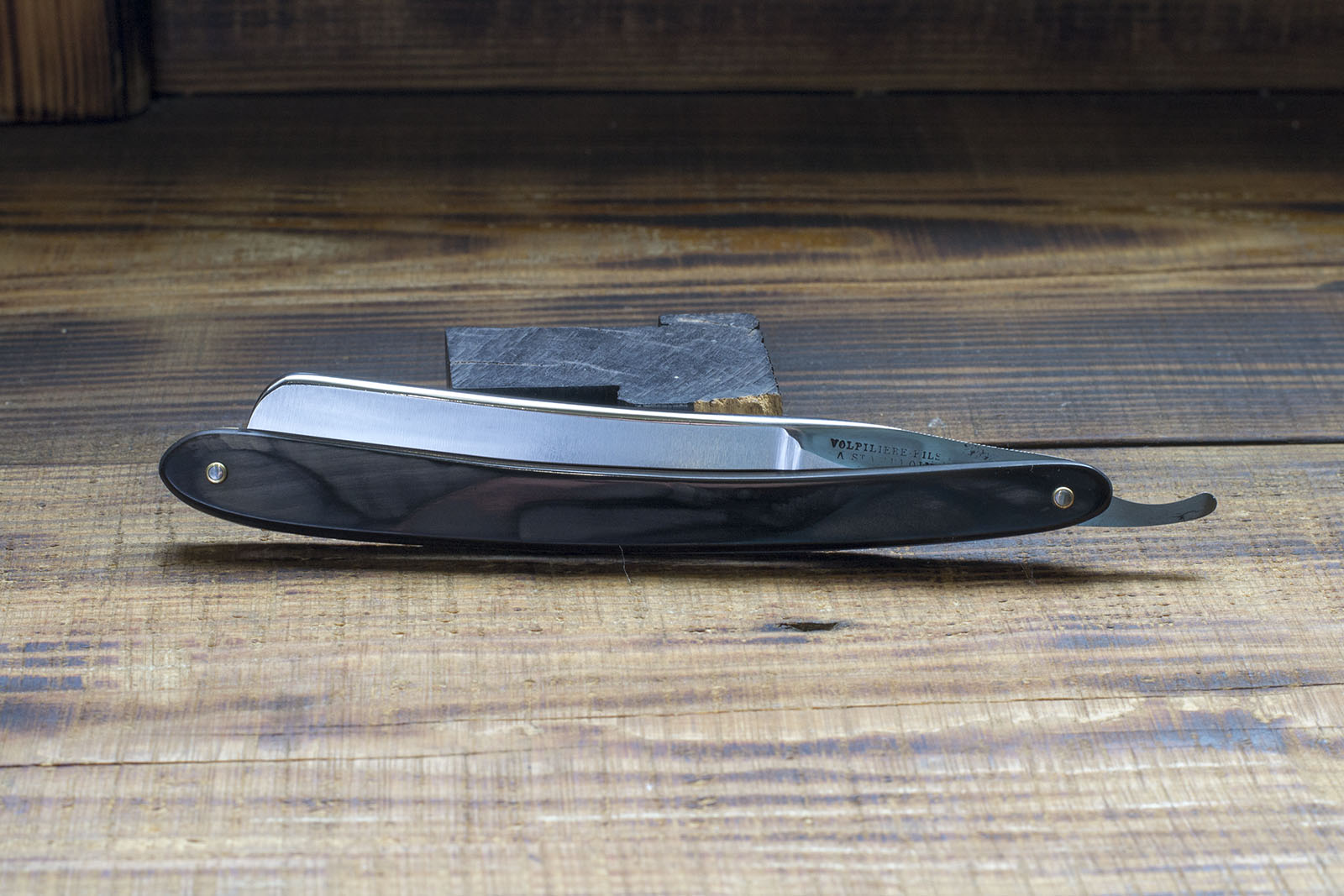 Старый клин, с прекрасной геометрией, изготовленный из качественной углеродистой стали во Франции. К сожалению период производства определить затруднительно, французы долгое время были приверженцами классических форм и подобные полотна выпускались до начала 20 века, но по косвенным признакам - форме родной рукояти и состоянию рога рискну предположить что это 70-80 гг 19 века. Бритва имеет крайне удобный эрль с подпальцевой выемкой, массивный широкий обух, ширина полотна 18.4 мм, отлично подходит для повседневного бритья и окантовки. Фаска режущей кромки тонкая и равномерная, свидетельство правильной геометрии полотна. Форма полотна уравномерно улыбчивая, что так же считаю несомненным плюсом. Бритва имеет новую роговую рукоять, изготовленную в соответствии с оригинальной, заточена и готова к бритью. Продано Volpiliere Fils. Show