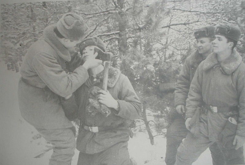 Интересные фото с бритвойБриться зимой в лесу?! Чего то тут не так. Обратите внимание на руку парня которого "бреют". Он как бы отстраняет руку "барбера". Типа говорит "не надо, я больше не буду...". Похоже на рэкет Интересные фото с бритвойrunastep, просто бриться не хочет