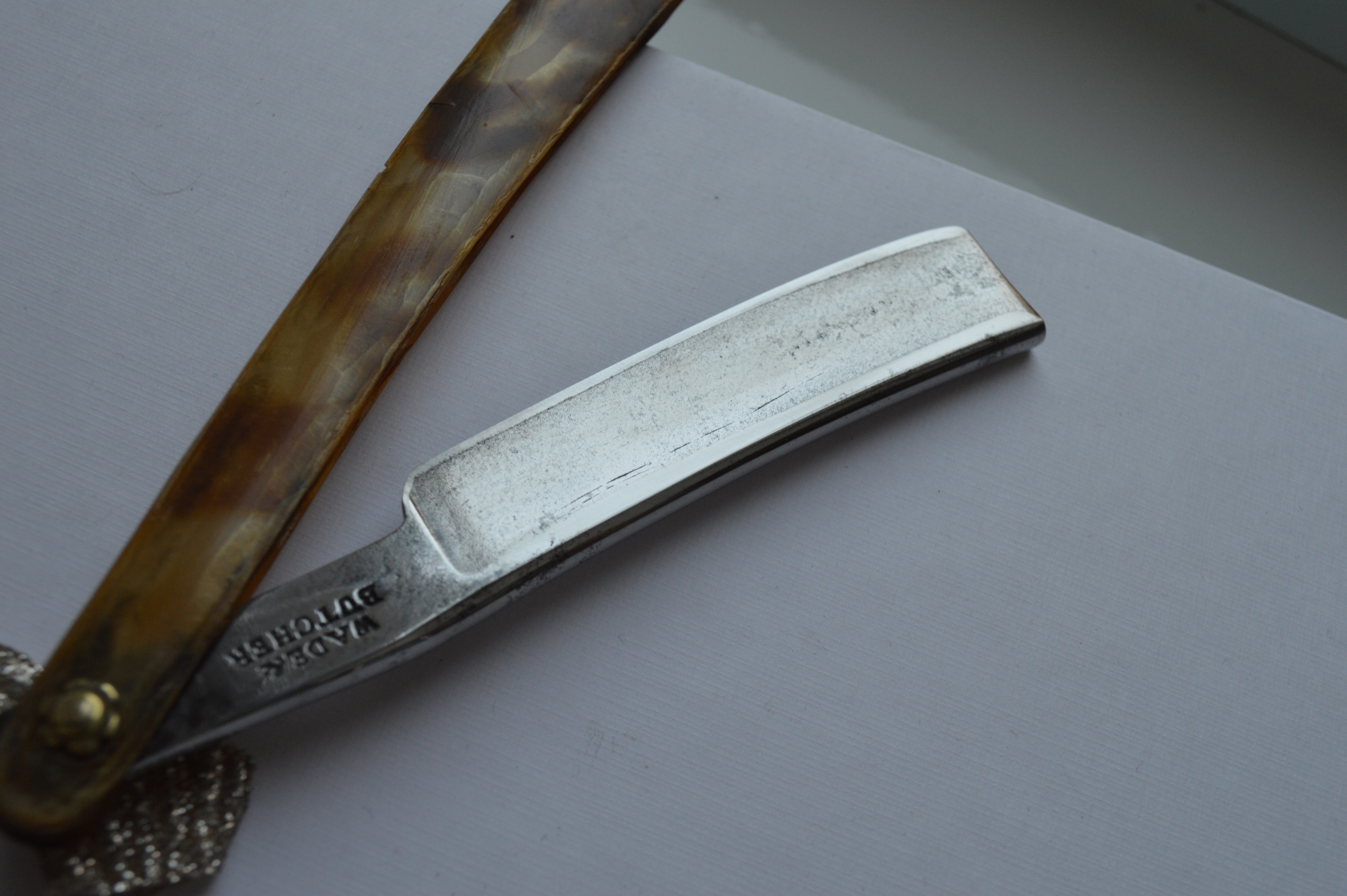 изначально бритва пришла с "передавленной" кромкой на одну сторону, разной шириной фасок в районе пятки и тд и тп...кто-то пытался затачивать, но не понял в чем смысл. ну и еще я не очень рад, что это первая бритва, на которой я не заметил регринд по фотографиям, плюс продавец намеренно шкрябал наждачкой горизонтально, чтоб его скрыть и скрыть перепад в отражении по бликам... так как в районе пятки с двух сторон выборка при регринде сделана была раза в 2 меньше, чем по остальной площади клинка. как-то так.