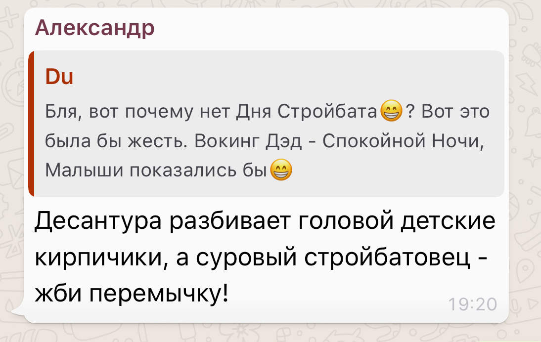 Анекдоты и приколы не в тему:)Намедни как раз обсуждали, почему нету Дня Стройбата. Замечательный человек с исконно питерским чувством юмора написал