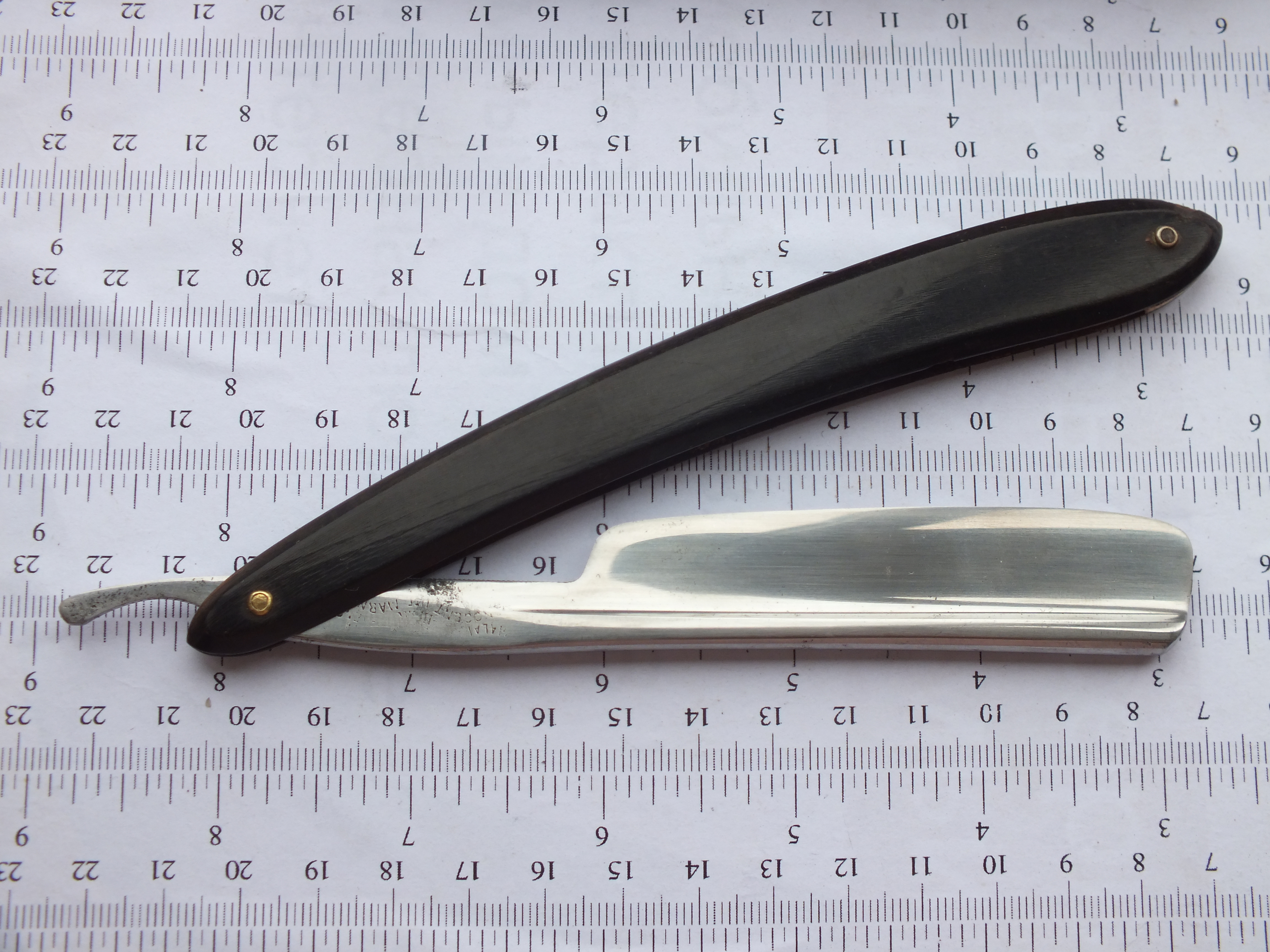 Конец 19 века. Ширина11/16, вогнутость 1/2 холлоу. Оправа рог, клинышек кость. Бритва заточена и готова к бритью. Продана на другом ресурсе. Spoiler Show