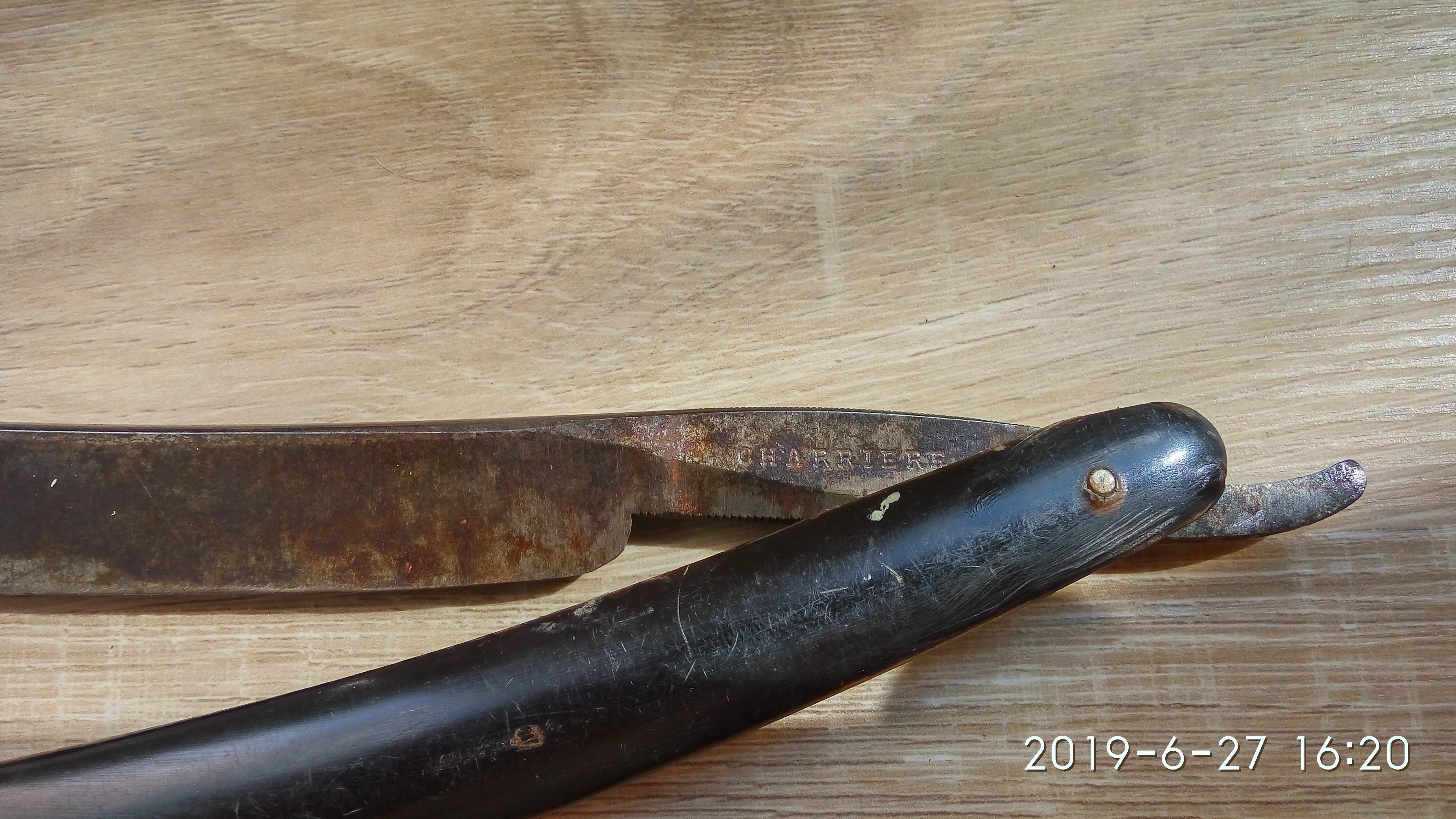 Бритва до... и после...Взял, продаренный wrenом японский клинок, протёр тряпочкой с хлорным железом и прилепил кап японского клёна)