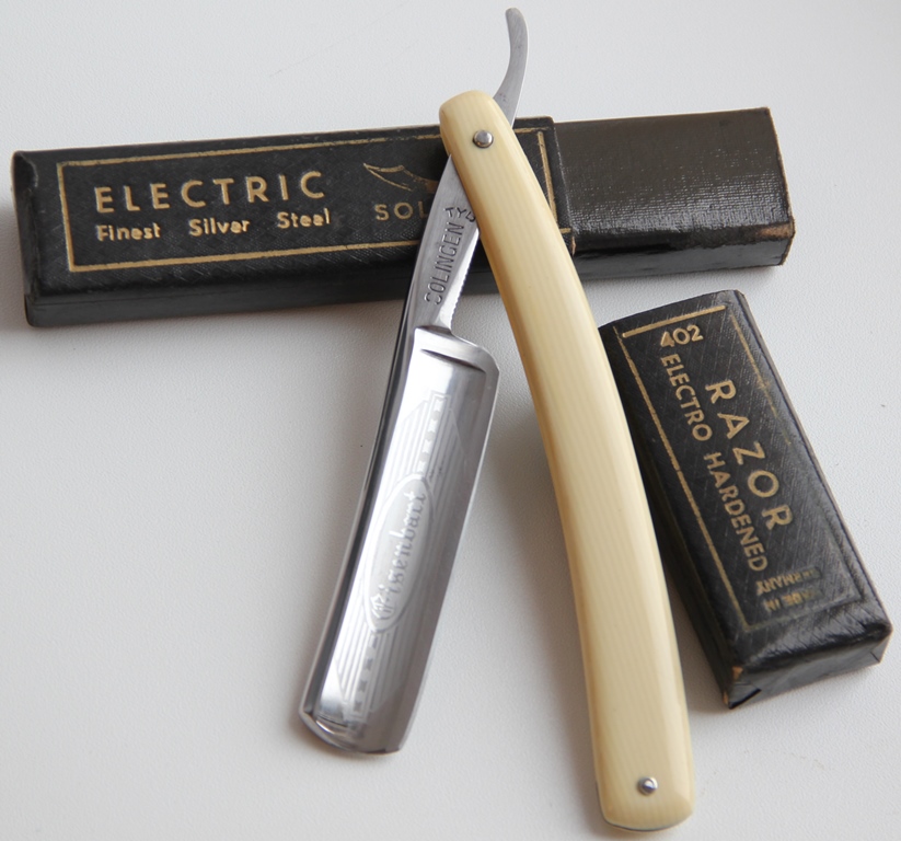 Ширина полотна-19 мм Толщина обушка-5.5 мм Полная вогнутость. Углеродистая сталь. Примерно 60-70-е годы производства. Также, один из известнейших немецких брендов, историю которой можно почитать на многих ресурсах. Бритва находится в прекрасном состоянии, с едва уловимыми следами краткосрочного пользовании в прошлом.Со своей стороны разобрал бритву,немного освежил металл от древней патины, на тонких абразивах и обратно собрал, сохранив родные пины.Бритва очень приятная во всех смыслах: будет удобна как в бритье, так и внешне красива и сбалансирована. Сталь чистая от любого рода дефектов, клинок имеет идеальную геометрию и равномерную кромку.Будет идеальным вариантом как для новичка, который желает иметь практичную и удобную вещь, от известного производителя прошлого, но так и для любого опытного любителя Бритвы.Не пропустите красивую и относительно недорогую бритву. Заточена и готова к бритью. Цена-5500 р с доставкой. ПРОДАН Spoiler Show