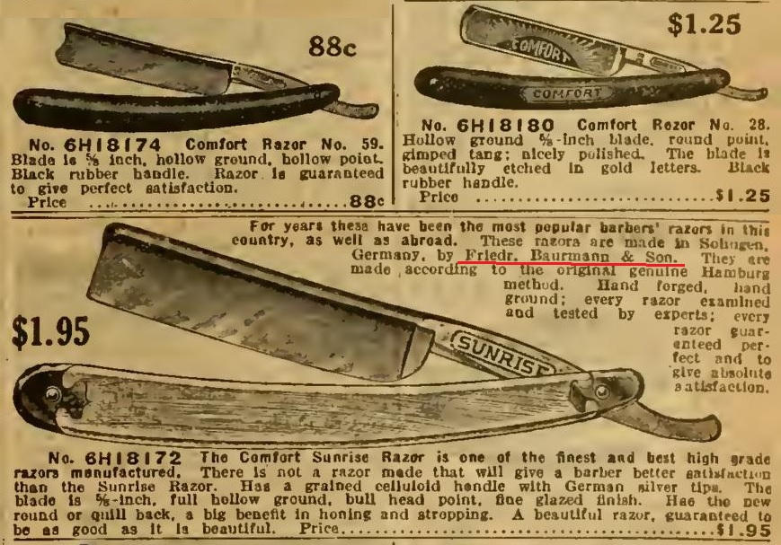 FRIEDR. BAURMANN & SOHNE SOLINGEN - GERMANY *Мне кажется это бессмысленно. Номер модели 70. - Временные рамки установлены очень чётко, в отличии от обычных "первая треть или первая половина ХХ века" - Страна производства точнее некуда - Германия. Более того, Золинген. Можно найти улицу и номер дома. - А уж куда поставлялась дело второе (на ней не написано). Может в Аргентину. Американцы, включая SRD четко ставили свои клейма на бритве и цена была выше. Без доп. клейм продавали оптовики совсем задёшево. Если и найдется подобная с коробочкой и знаками дистрибьютора, далеко не факт, что все такие бритвы шли через него. - Материал. А что материал? ГОСТов, ISO и прочей стандартизации не было. Делали как могли и как хотели. Точно состав стали можно узнать только лабораторным анализом. Все эти надписи типа Diamond steel равно как поздние Super Quality Steel имеют отношение больше к маркетингу. А на пилах писали Razor Steel. Вот бритвы из каталога Sears Roebuck And Co 1912 года. Модели номер 28, 59 и без номера. Что это нам дает? Год (внутри большого промежутка), товары почтой, нет маркировки заказчика, цену, внешний вид. Про сталь никто никогда не писал