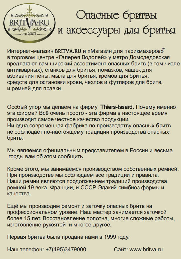 Это о грустном. Т.к. они пробегая мимо кричали : - "Шаветты есть?" Из положительного: Сегодня окучил кучу барберов уже с другим подходом. Заходил уже со стороны клиентской базы. Многие клиенты барберов интересуются опасными бритвами для себя. Раздали н-ное количество визиток и для таких. Зацепил и крутую тему франчайзи мини-витрины Тьер-Иссар для барбершопов. Что является, по-сути, ноу хау. Короче, народ окучили, плодов и продаж пока нет, но... ... есть надежда, что дело примет и другой оборот... Ремонт опасных бритв, звонить с 11-00 до 23-00, +79267729357, (viber, whats app, telegram, VK), спросить Олега.