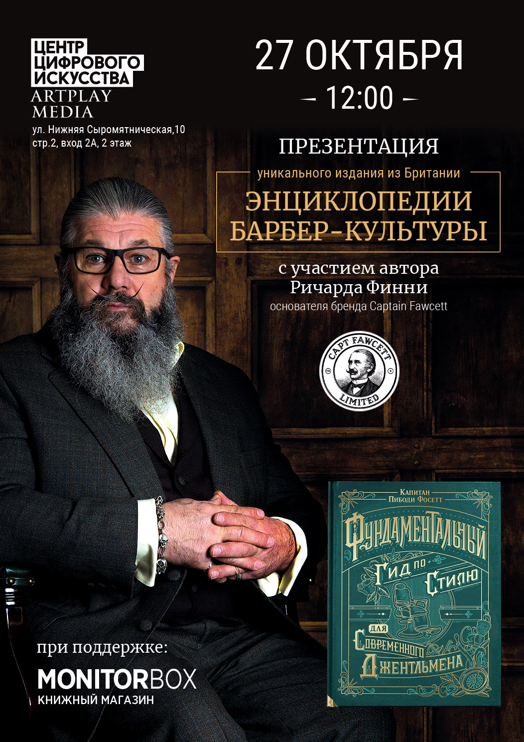 27 октября (Воскресение) в 12:00 приглашаем вас посетить презентацию долгожданного русскоязычного издания книги “Фундаментальный гид по стилю для современного джентльмена” с участием ее автора, британца Ричарда Финни. Эта книга посвящена теме персонального груминга, также являясь своего рода энциклопедией барберского ремесла. В оригинале книга называется The Quintessential Grooming Guide for the Modern Gentleman, переведена на 7 языков и издана тиражом более 50 тысяч копий по всему миру. Вы сможете лично пообщаться с автором этого уникального издания, услышать историю создания книги, приобрести заветный экземпляр, а также обзавестись автографом столь уважаемого джентльмена, который прибудет в Москву для того чтобы порадовать своих читателей, а также выступить в роли судьи на Всероссийском Чемпионате Бород и Усов в рамках фестиваля Russian Barber Week. Ричард также является основателем компании Captain Fawcett, производящей весь спектр мужских уходовых средств. Именно псевдоним Капитана Пибоди Фосетта, отважного путешественника и искателя приключений Викторианской эпохи был выбран автором, чтобы вести столь вдохновенное и остроумное повествование, так изящно раскрывающее образ современного джентльмена на страницах книги. Мероприятие, организованное совместно с книжным магазином MonitorBox пройдет в Центре Цифрового Искусства ArtplayMedia по адресу ул. Нижняя Сыромятническая д.10, стр.2, 2 этаж, вход 2А. ВХОД СВОБОДНЫЙ. Будем рады видеть вас среди гостей мероприятия! Текст поста согласован с администратором: Олег Бритва