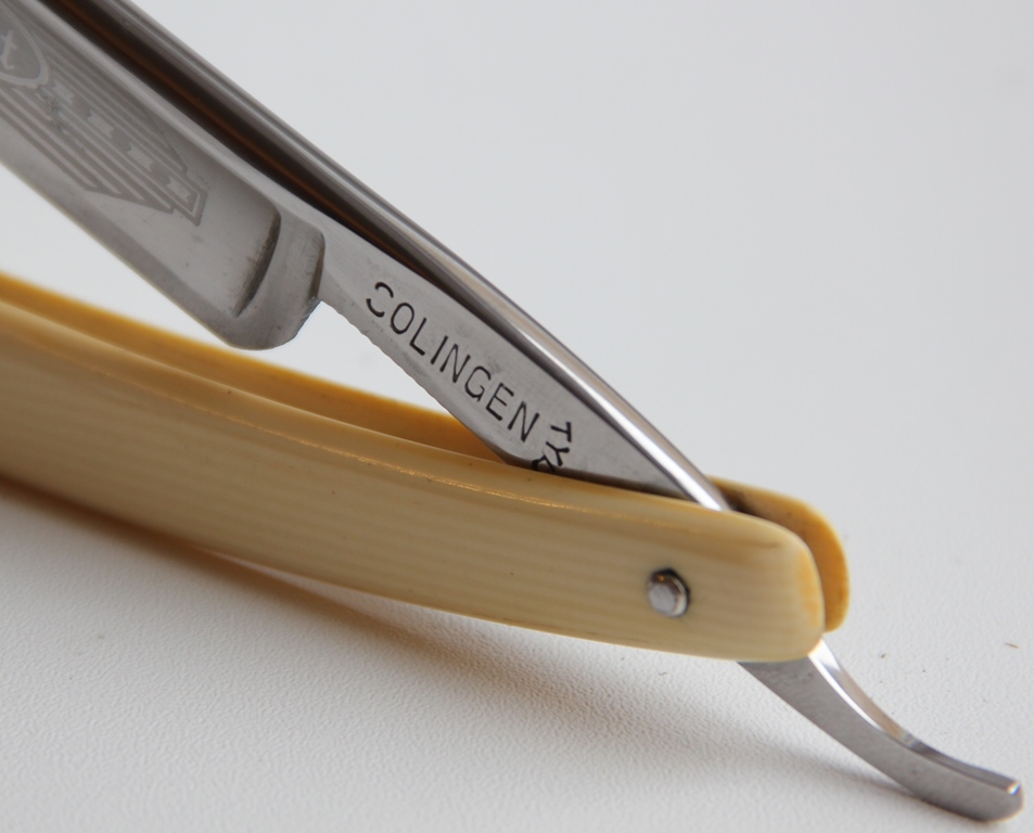 Бритва SOLINGEN Ширина полотна-20.5 мм Толщина обушка-6.2 мм Полная вогнутость. Углеродистая сталь. Примерно 60-е года производства. Бритва непользованная, не имеющая следов от заточных камней на обушке, уточки полотна и других дефектов при эксплуатации.Сам клинок мощный. Можно увидеть отчетливую "ступеньку" при переходе от вогнутости полотна до района кромки, в связи с чем жало бритвы не эластичное, как на бритвах с полной вогнутостью, а имеет достаточную жесткость. Сталь твердая при заточке. Сам клинок не подвергался никаким работам:имеет оригинальную шлифовку и полировку. Единственно что сделал, поменял кривой осевой пин, сохранив родные шайбы.В общем и целом бритва очень достойная, с отличной сталью,тяжелая. Могу рекомендовать как новичкам, так и опытным пользователям, особенно тем, кто имеет жесткую щетину. Заточена и готова к бритью. Цена-8500 р с доставкой. ПРОДАН Spoiler Show