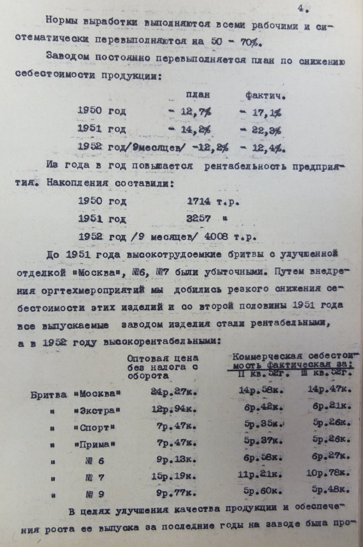 - силами завода сконструированы и изготовлены шлифовальные станки, что позволило внедрить поточный метод чистовой шлифовки и полировки бритв.