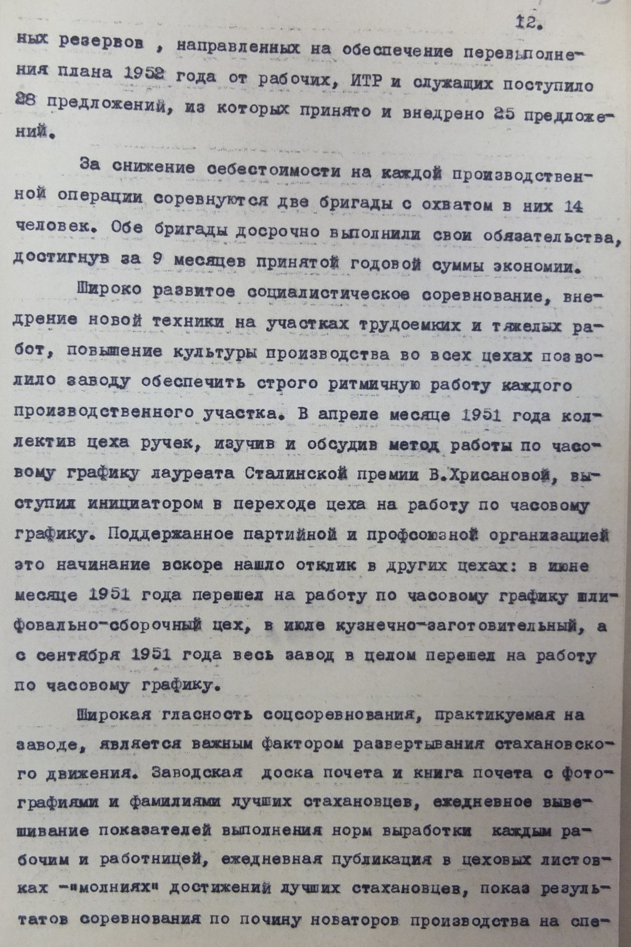 В эти дни во всех цехах завода идет социалистическое соревнование в честь выборов в местные Советы. Завод завершил годовую программу и выпускает продукцию в счет 1951 года.