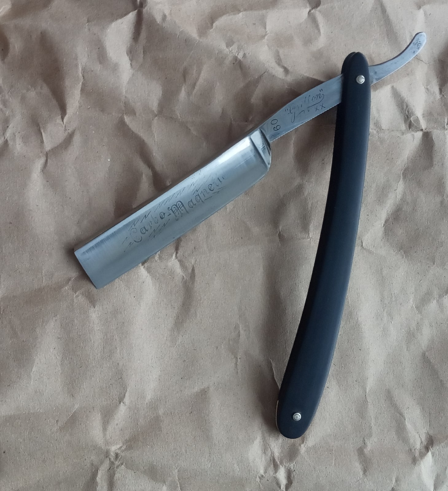 Ориентировочно сделана в первой половине ХХ века. Клинок - 16,5 мм с полной выборкой. Произведён в Германии. Оправа из какого-то пластика тех времён. Не разбиралась. Заточена. Цена: продано