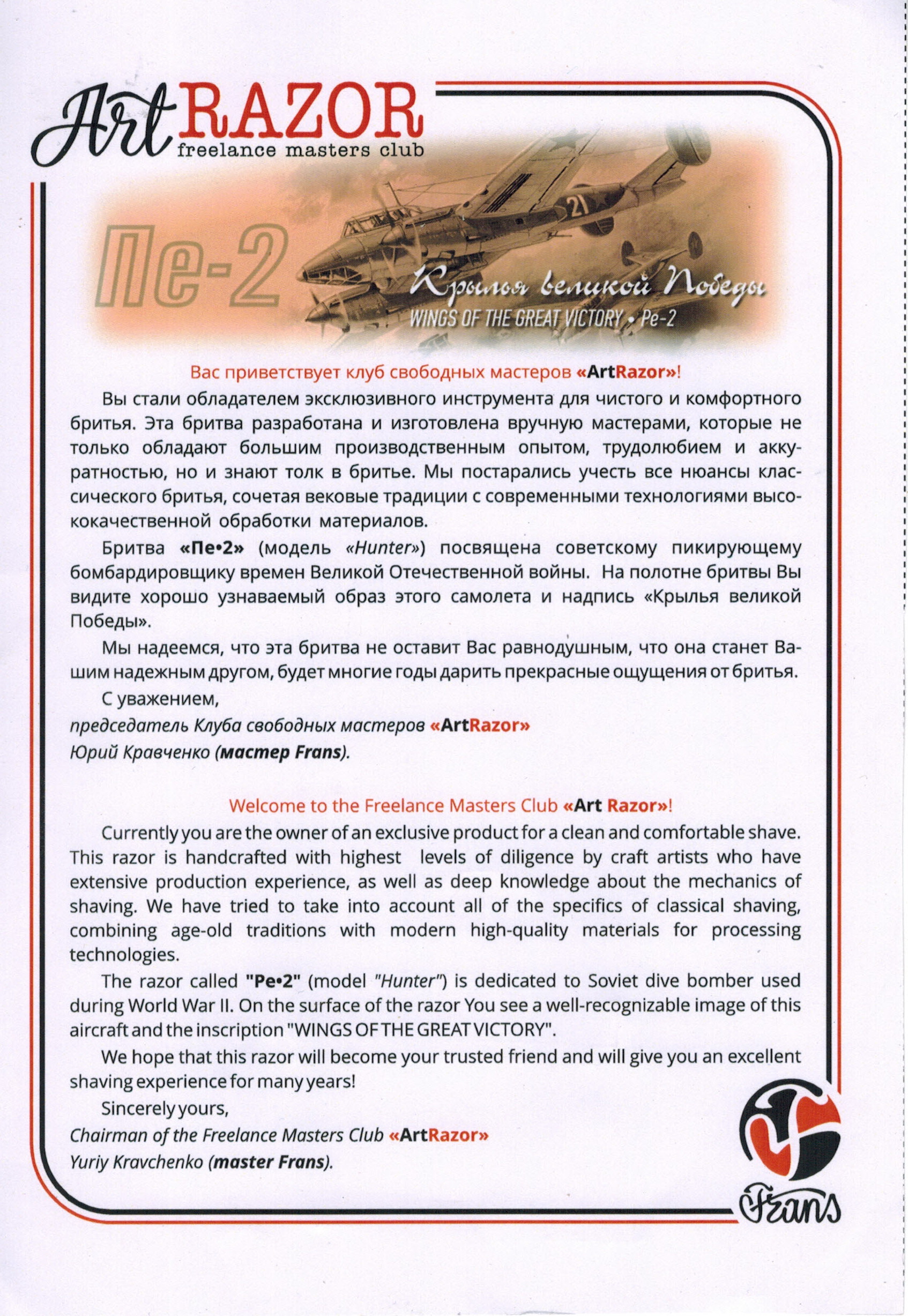Произведена интернациональным авторским коллективом ArtRazor. Серия "Hunter" Крылья Великой Победы, номер Hu001. Всего было выпущено две бритвы этой серии Hu001 - Пе-2 и Hu002 - Ла-5. Клинок исполнен Валерием Gvik из Казани. 5/8 Четверть холлоу. Сталь Udeholm Arne (Швеция). Оправа пластик. Коробка дуб. Сертификат и родная коробочка в наличии. Бритва заточена и готова к бритью. Цена $200