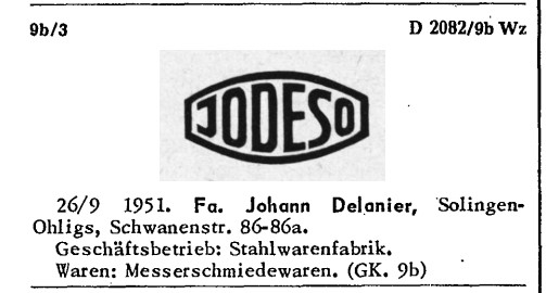Все фирмы и ТМ из Золингена и оканчивающиеся на "So"...JODESO - Joh. Delanier, Stahlwarenfabrik, Schwanenstraße, Ohligs. Основана в 1911 году, маленькая фабрика по производству ножей и ножниц.