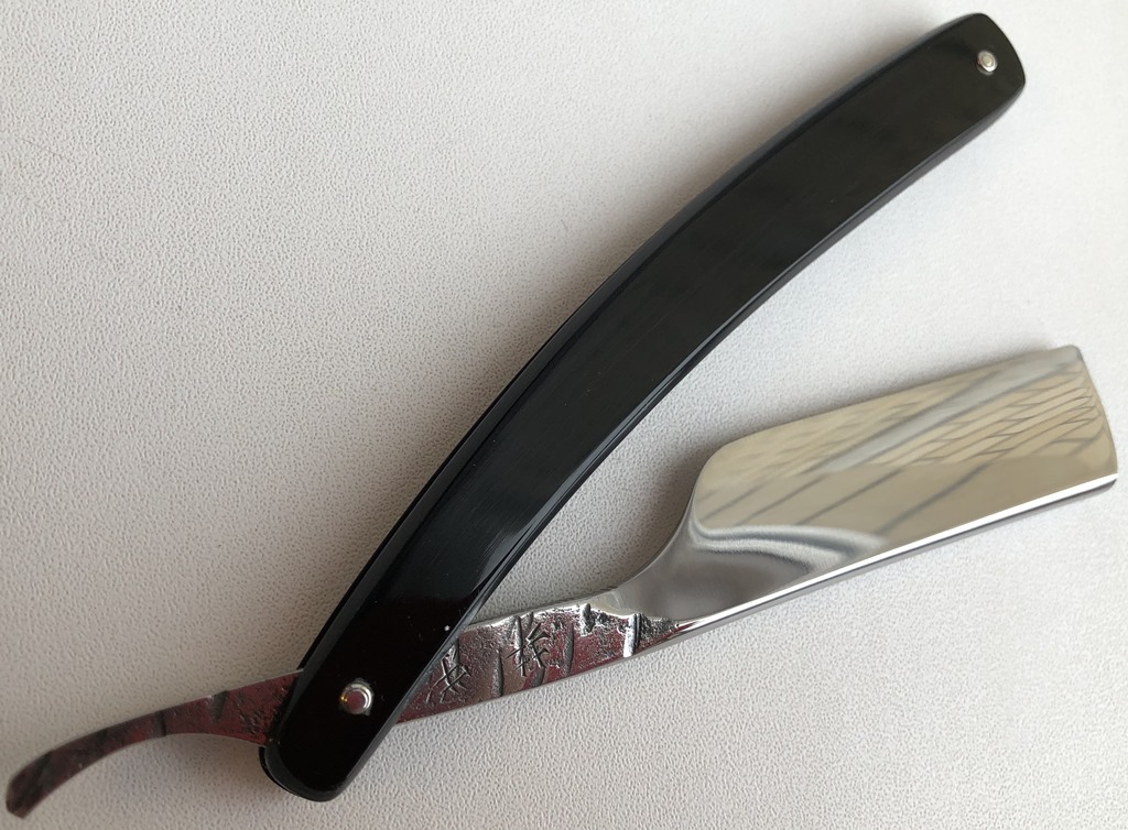 Бритва в очень хорошем состоянии. Разобрал, немного освежил металл и снова собрал, поменяв пины на более надёжные втулки, со внутренними шайбами.Сталь и кромка чистые, без видимых дефектов. Оправа из натурально рога также в отличном состоянии для своих лет. Бритва мощная, тяжёлая, но в тоже время имеет по-французски элегантные очертания.Красивая и практичная бритва, способная выдавать качественное и мягкое бритьё. Заточена и готова к пользованию.