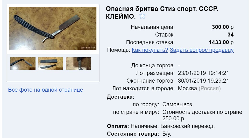 Что-то раньше я не особо собирал аукционы, поэтому пока их не много и выводы делать рано. Вот наберется штук 100 по советским бритвам, и сотня по иностранным, тогда и обработаем статистику.