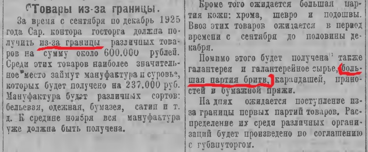 Завоз импортных товаров для Сибкрая с Карской экспедицией, в том числе и бритв 1157 штук.