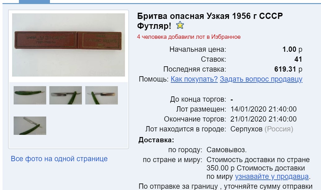 начальная цена 1 р дата окончания аукциона 19.01.2020 курс $ на 19.01.2020 = 61,53р итоговая цена 583 р или 9.47 $ в торгах участвовало 5 человек Spoiler Show аукционные цены на бритвы на российском рынкебритвы Спорт завода СТИЗ 1956г и безымянная.