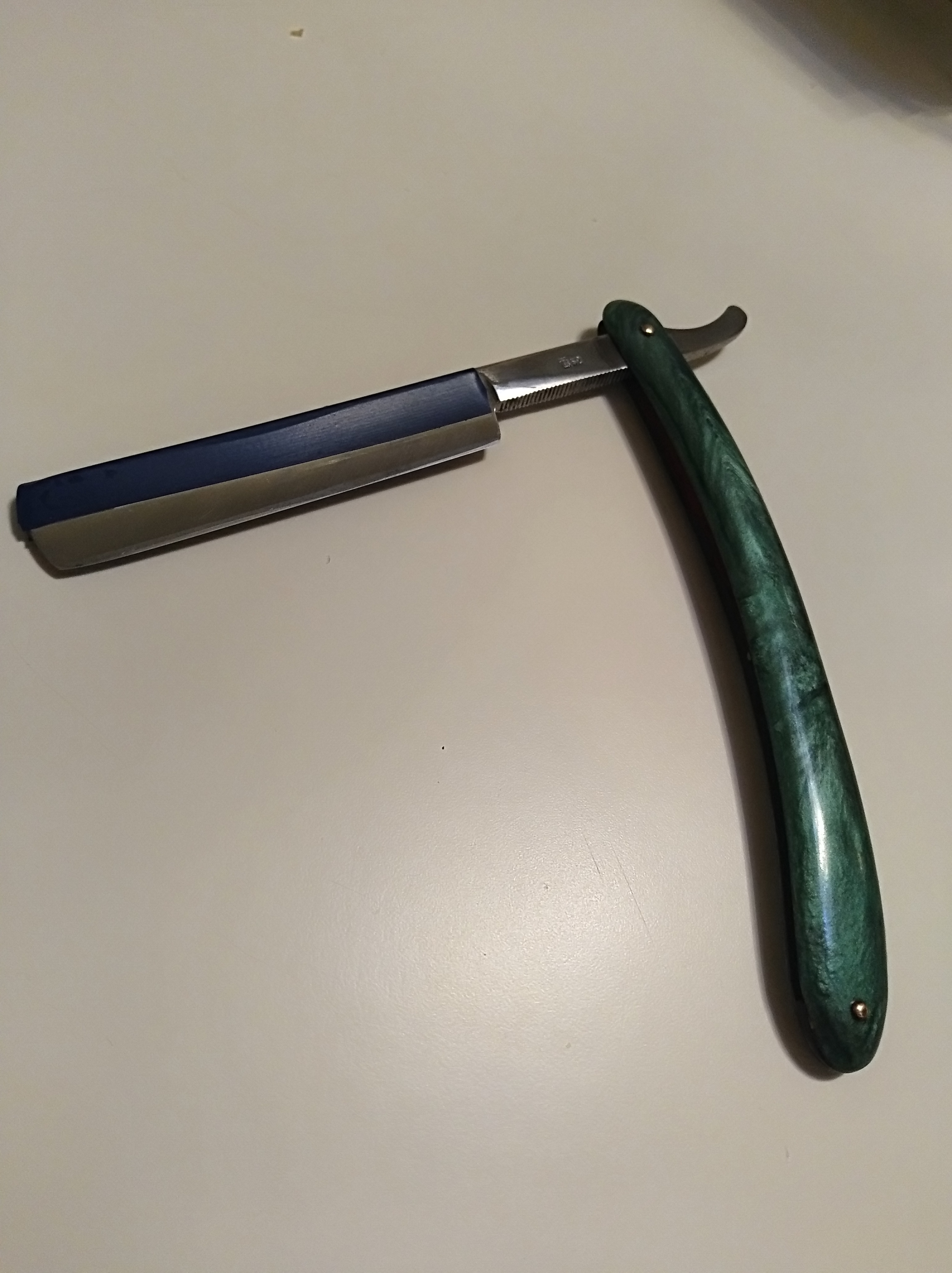 Тем не менее на стекле бритва с обеих сторон лежит абсолютно идеально. Если смотреть сверху, то все тоже ровно, только ближе к носику есть незначительное сужение. Бреет плохо, не дерет как тупая, но словно финиш закончен максимум тысячах на шести.