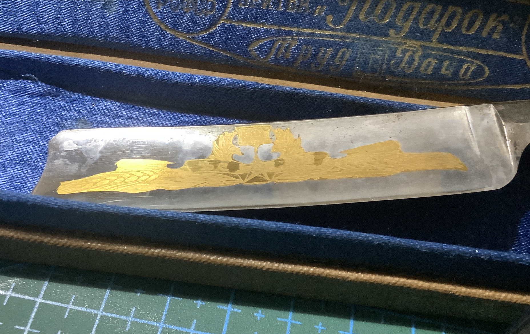 Еще в 1954 году это были двухзаковные с позолоченными гравировками. А в 1955 на бритве появилась надпись Подарок.