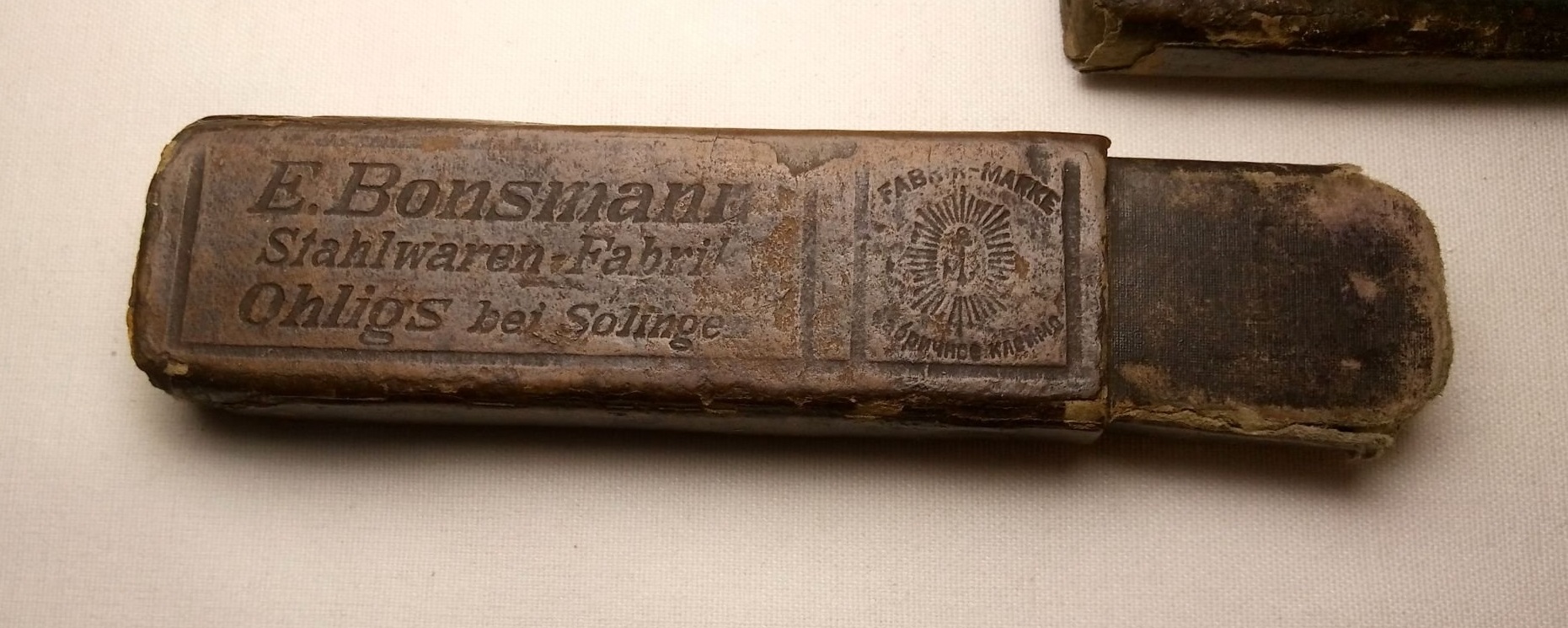 E.Bonsman Ohligs-Solingen*Олигс это уже Золинген. Соответственно можно вычислить дату. Ремонт опасных бритв, звонить с 11-00 до 23-00, +79267729357, (viber, whats app, telegram, VK), спросить Олега.