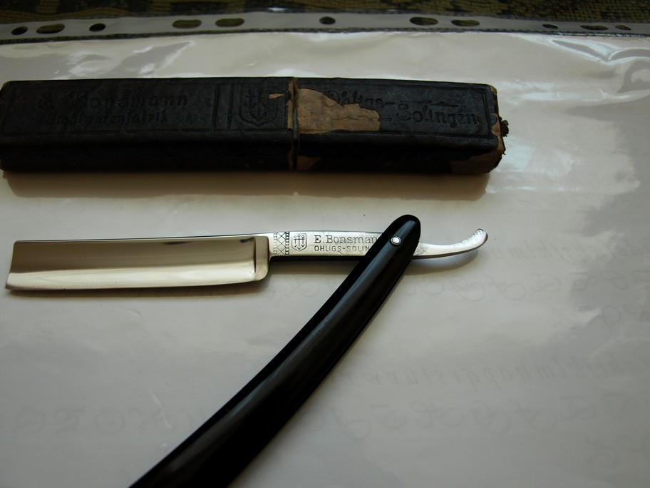 E.Bonsman Ohligs-Solingen*E.Bonsman Ohligs-Solingen, недавно досталась мне такая бритва, почистил, заточил. Позже фото выложу сюда, бритва была побита коррозией сильно и со сколом у пятки