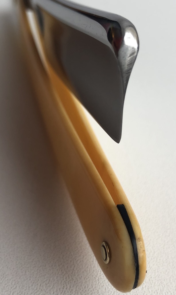 Бритва в очень хорошем состоянии , для своих лет.Мной не разбиралась, а если и разбиралась когда то, то очень давно, так как таких пинов сейчас не делают.Не уточена и имеет чуть заметные следы пользования.Сталь и кромка чистые, без дефектов.Родная роговая ручка также , в очень хорошем состоянии. Бритва миниатюрная, хотя достаточно увесистая, за счет своей формы лезвия. Подойдет не только для бритья, но и для коррекции усов и бороды.Можно порекомендовать опытным пользователям в качестве ещё одной в коллекцию, тем более вариант недорогой, но приятный во всех отношениях. Заточена и готова к бритью.