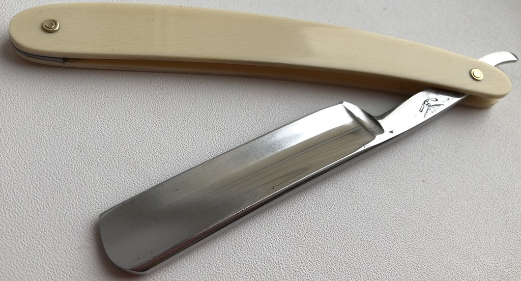 Бритва в очень хорошем состоянии , для своих лет.Мной не разбиралась, а если и разбиралась когда то, то очень давно, так как таких пинов сейчас не делают.Не уточена и имеет чуть заметные следы пользования.Сталь и кромка чистые, без дефектов.Родная роговая ручка также , в очень хорошем состоянии. Бритва миниатюрная, хотя достаточно увесистая, за счет своей формы лезвия. Подойдет не только для бритья, но и для коррекции усов и бороды.Можно порекомендовать опытным пользователям в качестве ещё одной в коллекцию, тем более вариант недорогой, но приятный во всех отношениях. Заточена и готова к бритью.