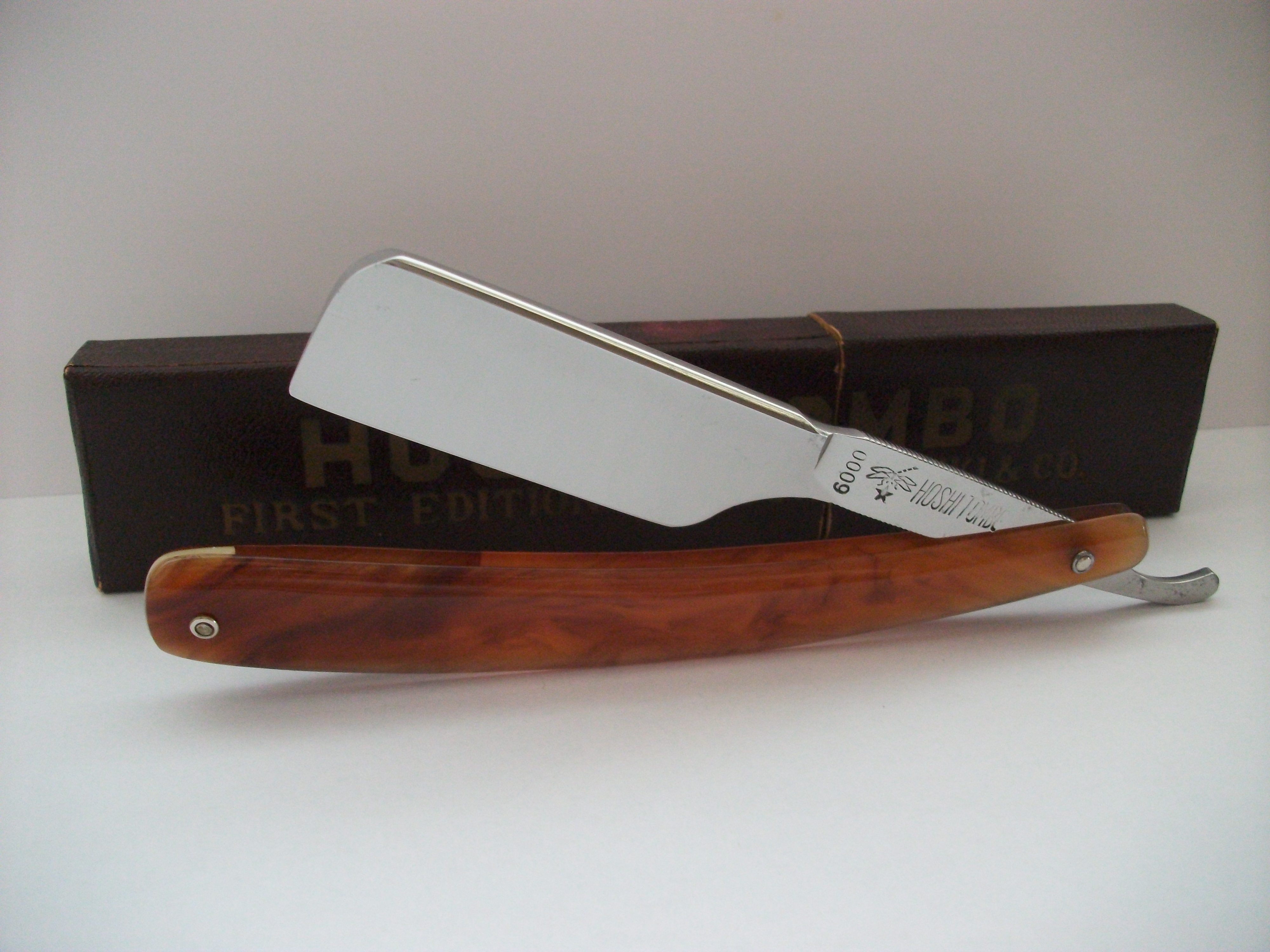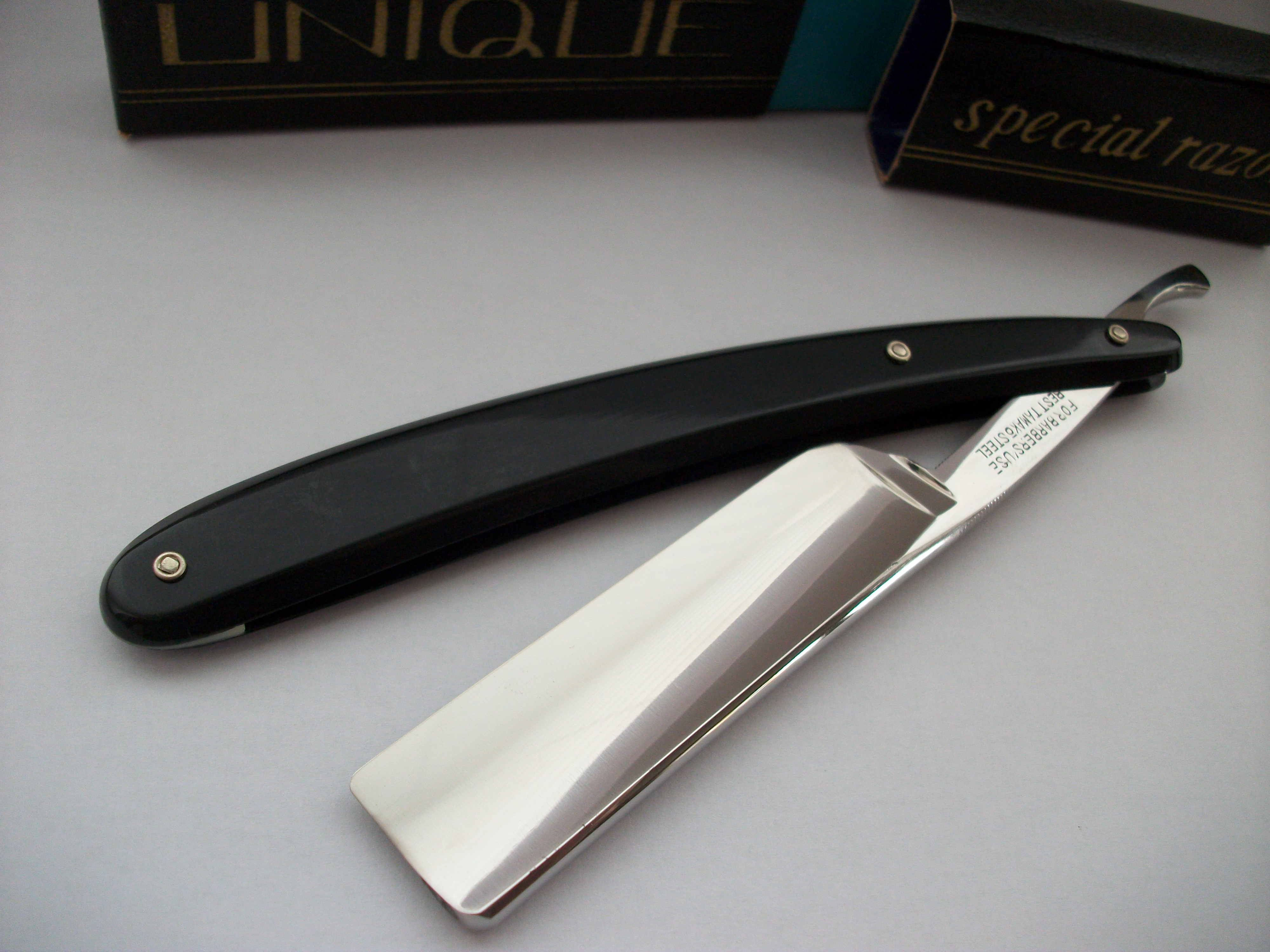 Экземпляр сочетающий такие несовместимые определения как Китай, качество, винтаж... Бритва имеет хорошую геометрию, углеродистая сталь, ширина полотна почти 21мм, длина режущей кромки 68мм, ручка пластик. Примерно 50-70 года ИМХО. Заточена и готова к бритью. Продано Spoiler Show
