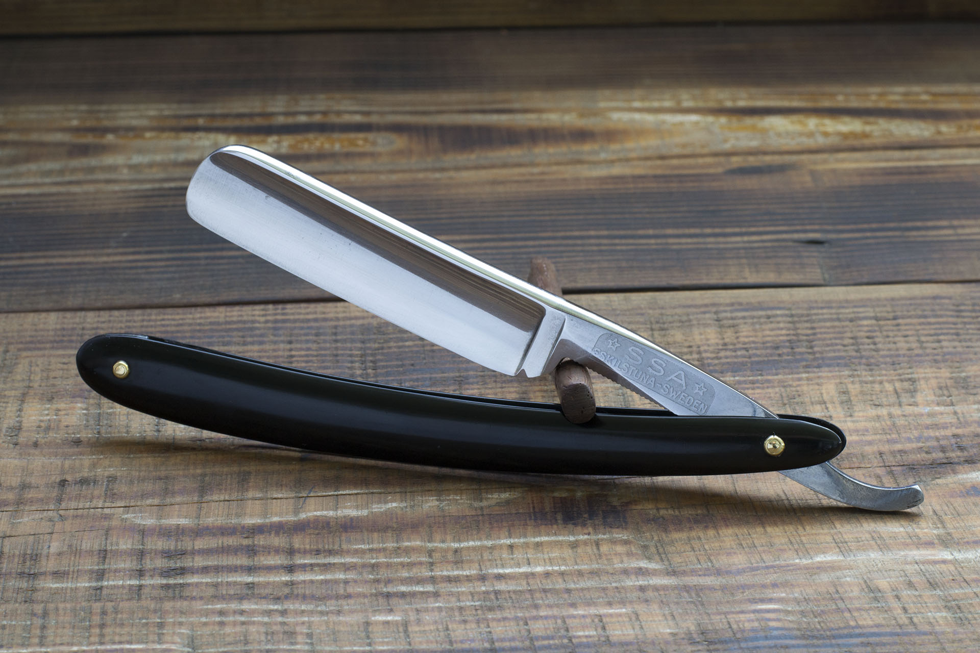 В рамках своего копания по закромам (нужно было освободить сундук под пшеницу) удалось найти вот такого представителя SSA (Svenska Stalsmides Aktich). Производство было налажно на базе бывшей фабрики Johan Enstrom в 1918 году, однако то что выпускалось Энгстремом имеет очень мало общего с бритвами SSA в плане приемственности. Это по прежнему очень хорошая сталь, высокое качество исполнения, но полностью модернизированное производство, выпускающее бритвы более современного дизайна, большинство из которых имело полную или трехчетвертную вогнутость, клейма теперь наносятся неглубоким травлением, кроме того меняются дизайн и материалы изготовления рукоятей. Интересно так же что бритвы SSA очень высоко ценятся на западе, что не скажешь о бритвах Энгстрем, оценивающихся гораздо скромнее. Данная бритва имеет ширину 18.4 мм, вогнутость 3/4, рукоять - эбонит. Почти новая бритва с незначительными следами заточки и окисления. Все что было сделано - полировка полотна, замена рукояти и заточка. Сталь без сомнения очень хороша, геометрия так же на высоком уровне. Бритва заточена и готова к бритью. Продано SSA Show