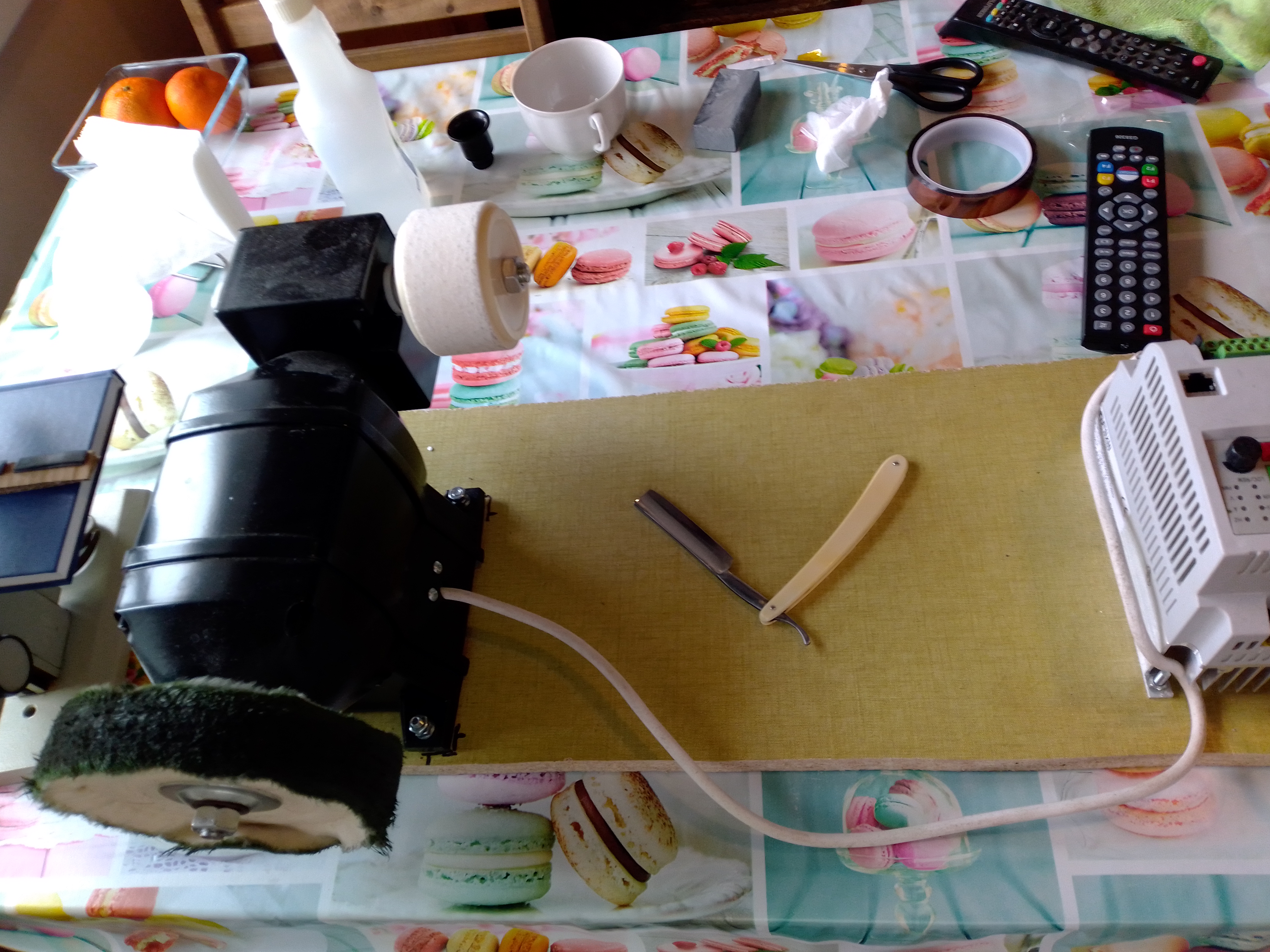 Восстановление опасной бритвыДелал на даче. Станок с частотником ,для мобильности прикрутил, на кусок ламинированного ДСП.