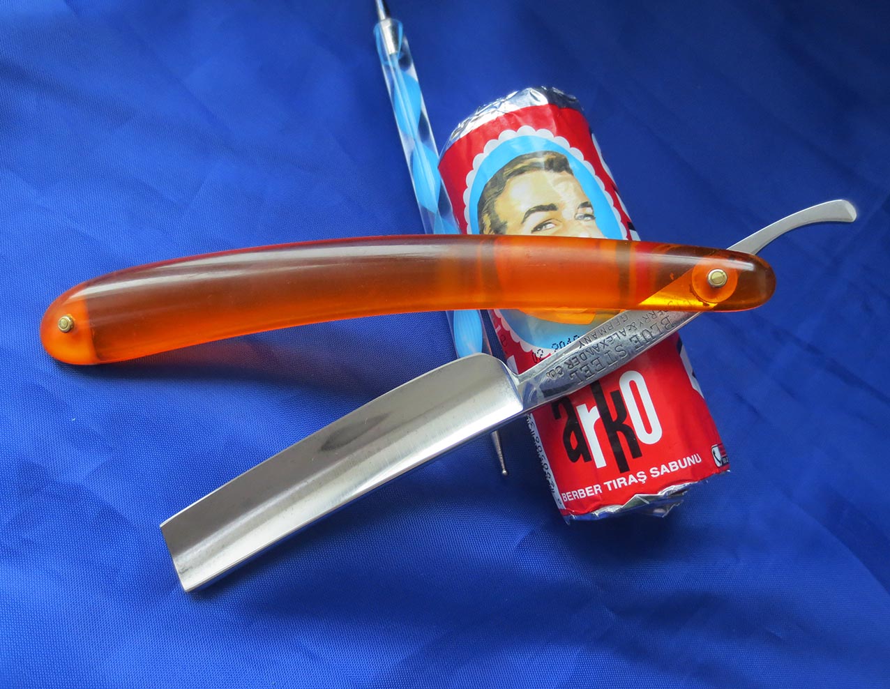 1) Опасная бритва Waterville Cutlery Company. Углеродистая сталь, ширина полотна - 4/8 дюйма, заводская оправа из эбонита, заклёпки - латунь. Приятная, верткая бритва для любого, от начинающего до профи, подойдёт не только для основного бритья, но и для обрамления усов и бороды... Заточена на японских водных камнях, протестирована, побрился отлично. После проверки продезинфицирована спецсредством "Миросептик" на этиловой основе, направлена и в работе до покупки не будет. 2) Также к бритве приложу заготовку из натуральной кожи растительного дубления для самостоятельного изготовления колодочного ремня для правки, размеры 280 х 50 мм. Данный набор достаточно недорогой, но в то же время весьма достойный вариант для новичка и не только, попробовать себя в этом настоящем мужском занятии, понять ваше это или нет,не вкладывая больших средств. Начинающим подскажу и покажу, как пользоваться и ухаживать за инструментом, также подскажу по изготовлению ремня для правки. Цена набора - 2600 рублей.