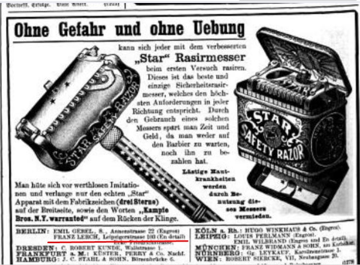 viewtopic.php?p=211068#p211068 По поводу Franz Lerch. Нашелся тезка, но очень похоже, что это он. Слишком много пересечений и Берлин и улица и бизнес. Фирма Micha & Lerch, присутствуют в адрессбухе Берлина в 1875 и 1877 годах. Anton Micha и Franz Lerch, охотничьи ружья, винтовки, револьверы, стоковые товары. Производство в Золингене, (Solinger Stahlwaren) Нашлись и их столовые ножички на одном из аукционов: Spoiler Show Бритвы гораздо позже 1870х годов, похоже что герр Franz Lerch на стыке веков начал самостоятельный бизнес в соседнем доме. Надо адрессбухи Берлина поискать за 1900-е года, пока не нашел. Franz LerchА вот, кстати, на коробочке написано дом 103, а не 130. нашелся Franz Lerch по этому адресу, в адрессбухе по Берлину за 1903 год