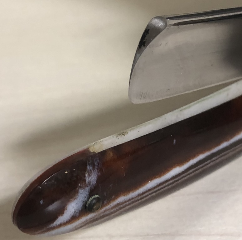 Ширина полотна-21 мм Толщина обушка-5.5 мм Форма лезвия-1/2 клина Углеродистая сталь. Бритва в очень хорошем состоянии, для своих лет.Не разбиралась и рне ремонтировалась, с минимальными и аккуратными следами пользования. Родная шлифовка и полировка полотна.Тяжёлая бритва, с мощной трёх-пиновой оправой.Сталь и кромка чистые, без видимых дефектов. Идеальная геометрия полотна..Красивая, с характером бритва, будет отличным дополнением для любой коллекции.Заточена и готова к бритью. Цена-6500 р с доставкой. ПРОДАН Внимание! Важная информация! Spoiler Show